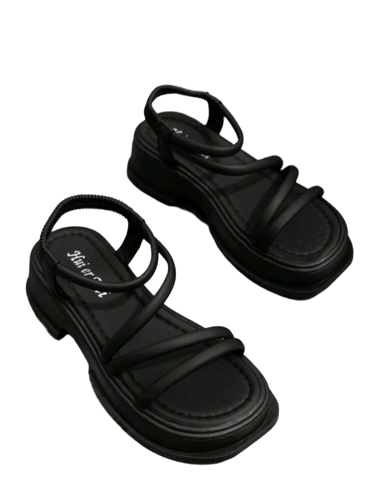 Címke nélküli, fekete, vastag talpú szandál, puha, lekerekített pántokkal és rugalmas bokapánttal a kényelmes illeszkedésért. Sportos és laza megjelenés, ideális hétköznapi viselethez, nyári sétákhoz vagy városi programokhoz.