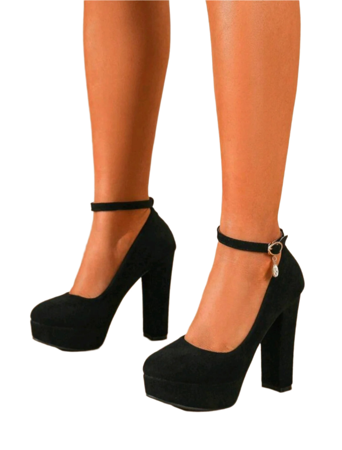 Címke nélküli, fekete, lekerekített orrú platformos magassarkú cipő, puha velúrhatású anyagból, vastag sarokkal és elegáns bokapánttal, melyet egy apró függődísz tesz különlegessé. Tökéletes választás bulikhoz, rendezvényekhez és alkalmi viselethez.