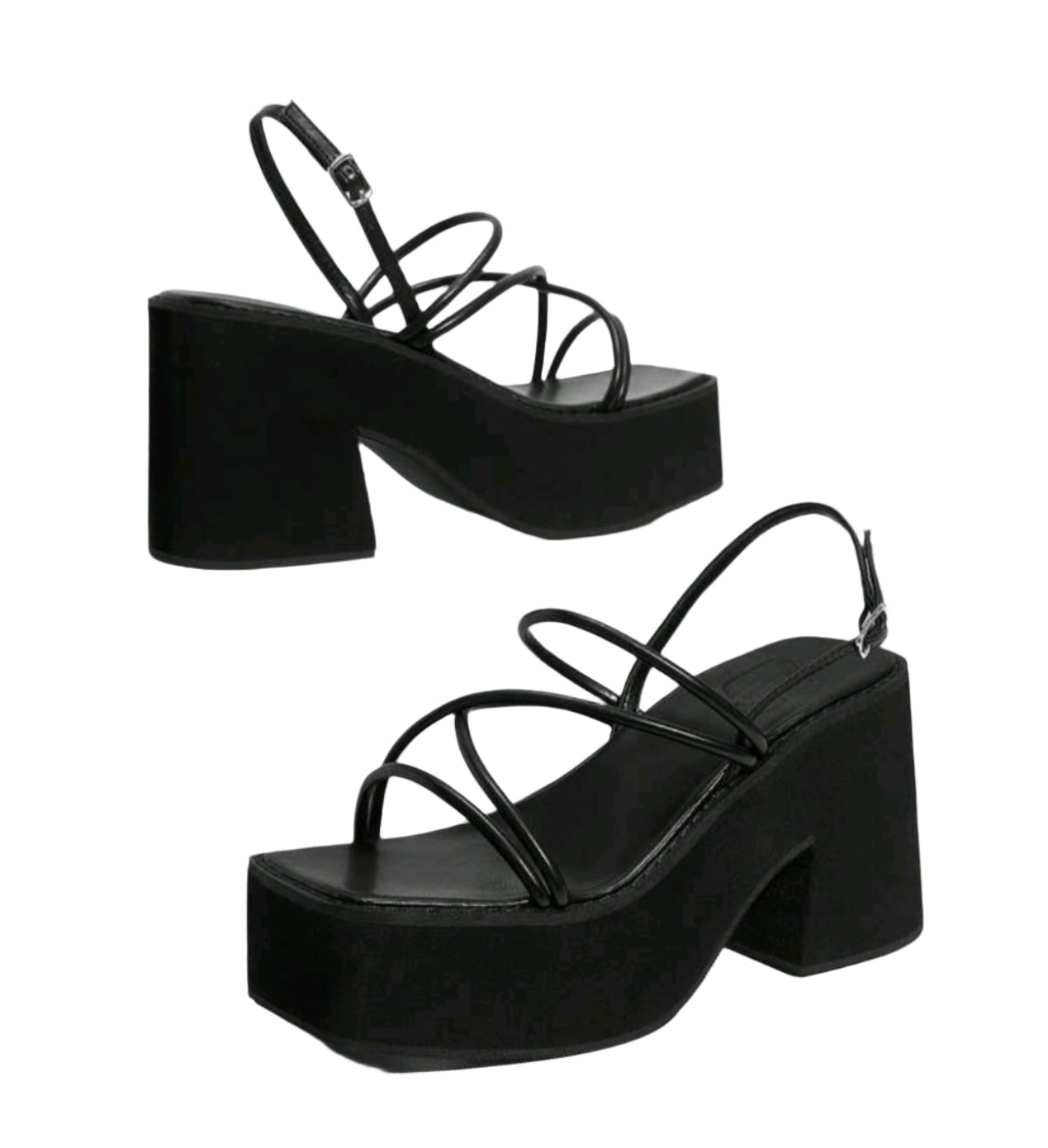 Címke nélküli, fekete platformos szandál modern vastag sarokkal és többsoros vékony pántokkal a lábfejen és bokán. Kényelmes és stabil viselet, amely egyszerre divatos és praktikus. Tökéletes választás bulira, utcai viseletre vagy hétköznapi elegáns outfitekhez.