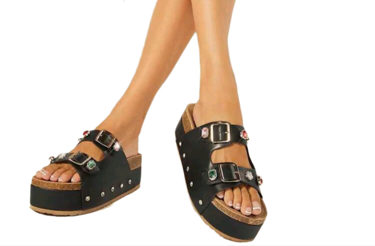Címke nélküli, stílusos fekete papucs állítható csatos pántokkal és színes díszkövekkel. Kényelmes platform talppal rendelkezik, amely extra magasságot és stabilitást biztosít. Ideális választás hétköznapi és trendi megjelenéshez.