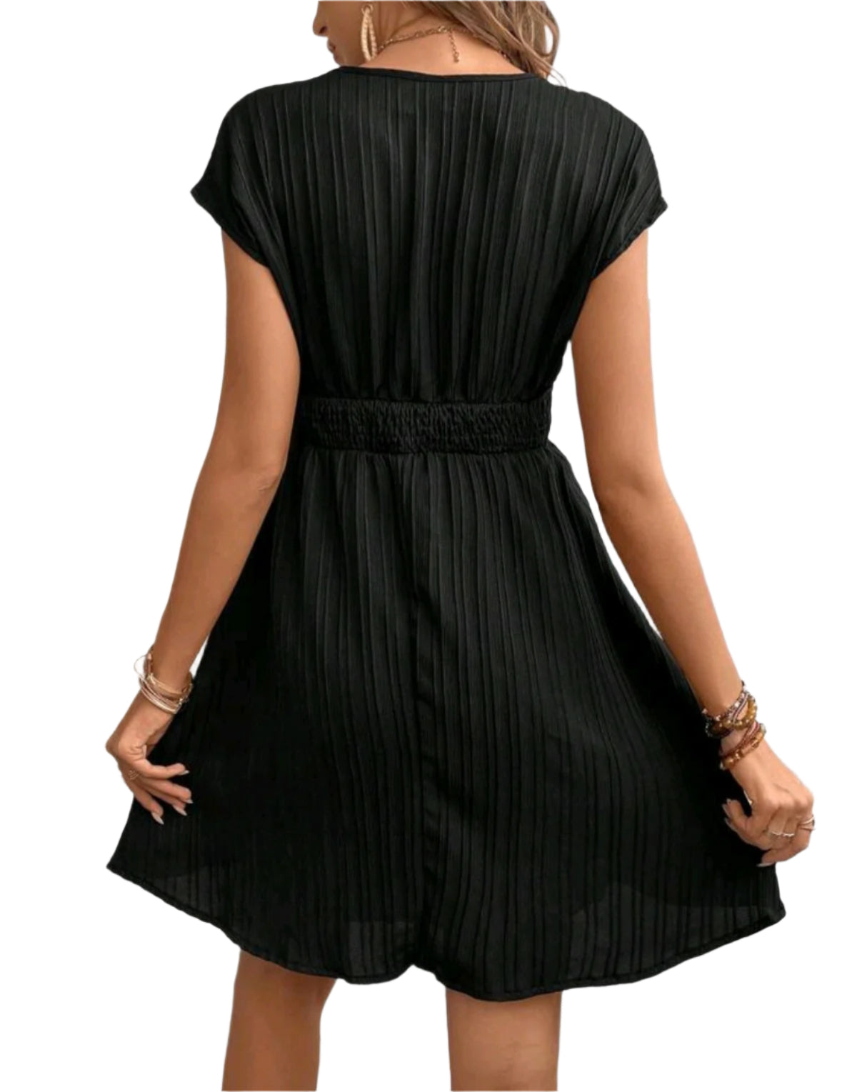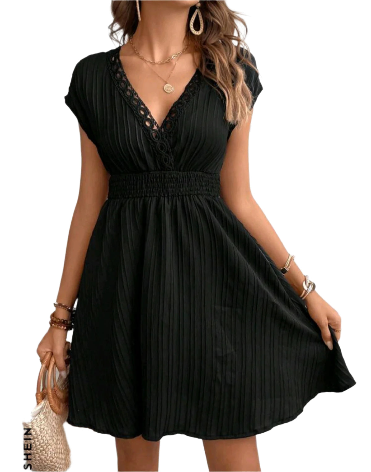 Címke nélküli, női nyári ruha, fekete színű, könnyed pliszírozott anyagból. Mély V-nyakkivágással, csipkés díszítéssel és rövid ujjakkal. Gumírozott derékrésszel, A-vonalú, bő szabású szoknyarésszel. Kényelmes és elegáns viselet, tökéletes nyári alkalmakra és hétköznapi outfitekhez.