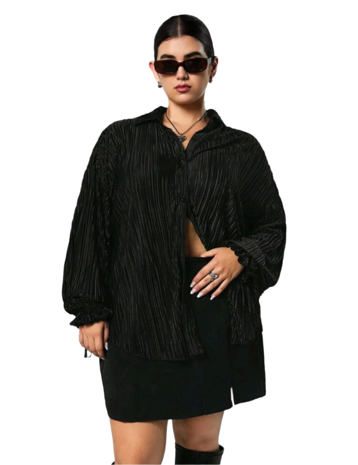 Címke nélküli, elegáns fekete pliszírozott anyagból készült ing. Klasszikus gallérral, gombos előlrésszel és hosszú ujjakkal rendelkezik, amelyek végén húzott mandzsetta található. Laza szabása stílusos és kényelmes viseletet biztosít, tökéletes alkalmi és hétköznapi szettekhez egyaránt.