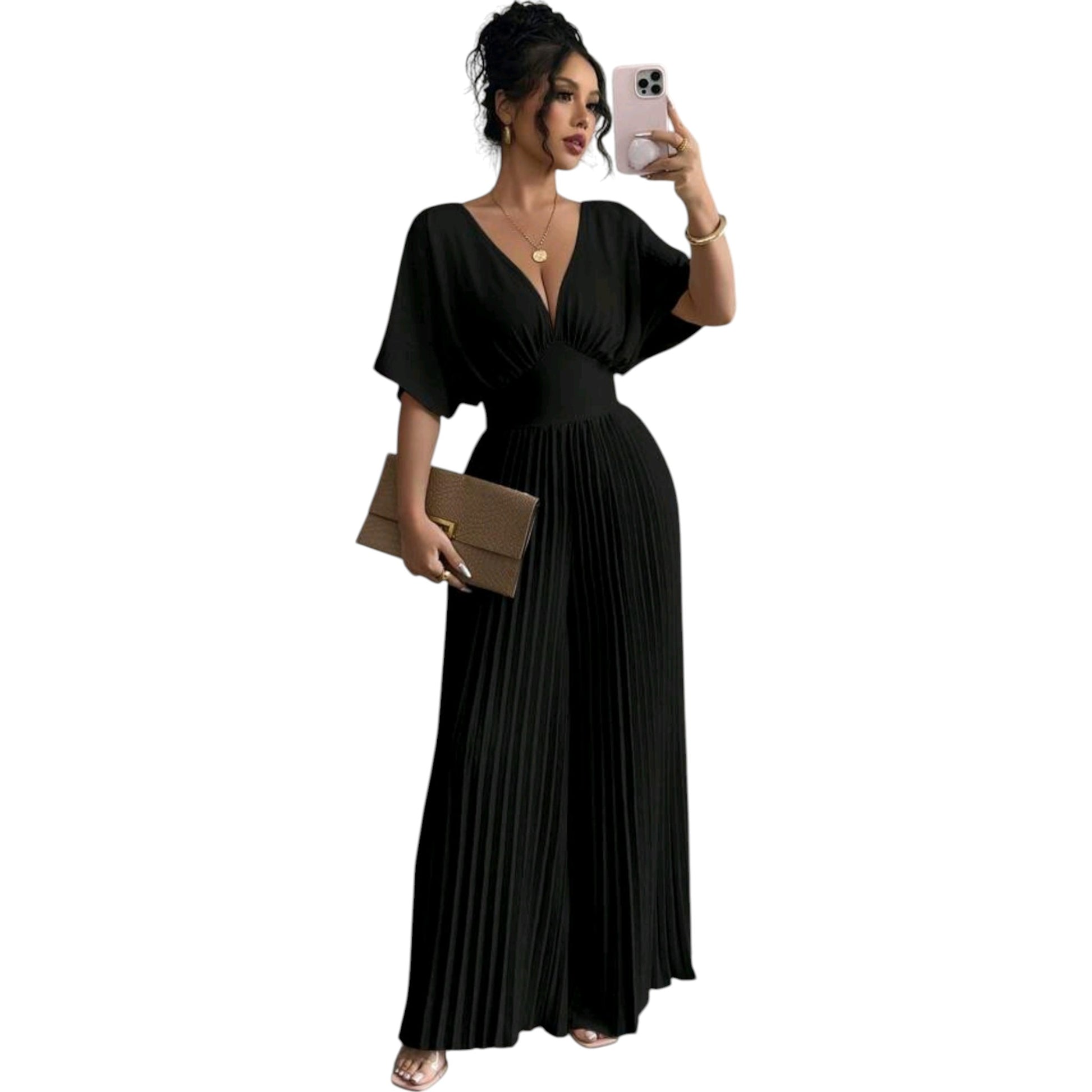 Címke nélküli, fekete, V-nyakú, rövid pillangó ujjú, széles szárú, pliszírozott nadrágrésszel.