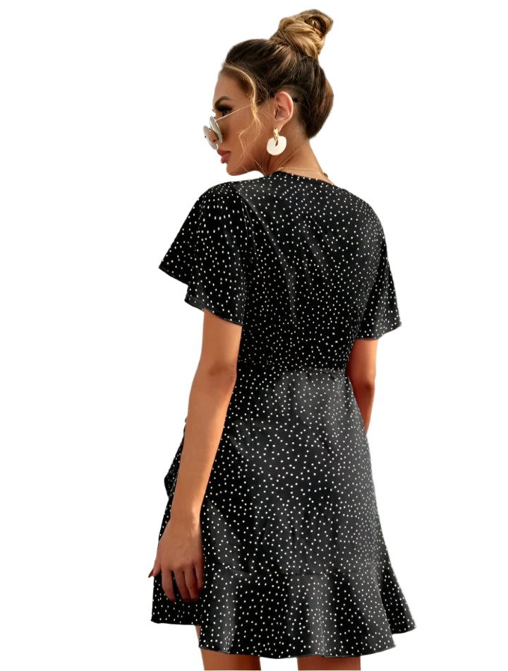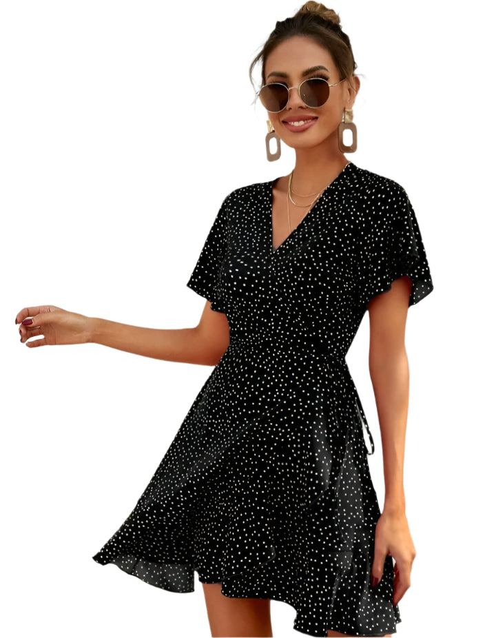 Címke nélküli, könnyed anyagú, V-nyakú rövid ruha. Derékban megkötős, fodros szegéllyel és rövid ujjakkal. Tökéletes választás nyári napokra vagy laza, elegáns megjelenéshez.