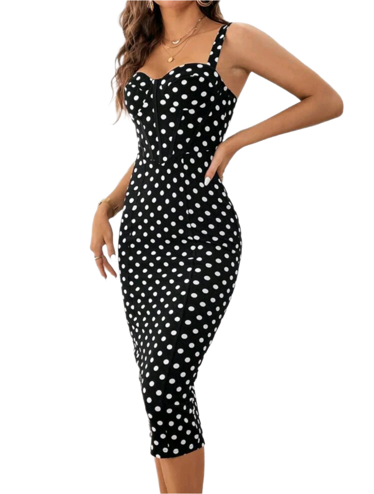 Címke nélküli, fekete alapon fehér pöttyös mintás, testhezálló midiruha vastag pántokkal és szív alakú nyakkivágással. A nőies szabás kiemeli az alakot, miközben elegáns és játékos megjelenést biztosít. Tökéletes választás randira, vacsorára vagy nyári eseményekre.