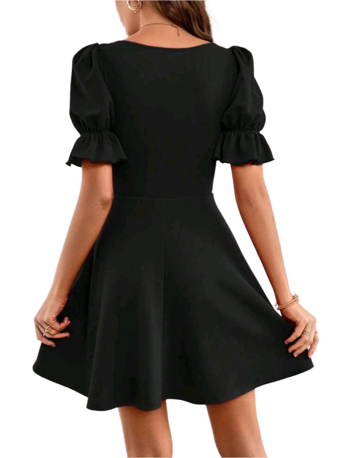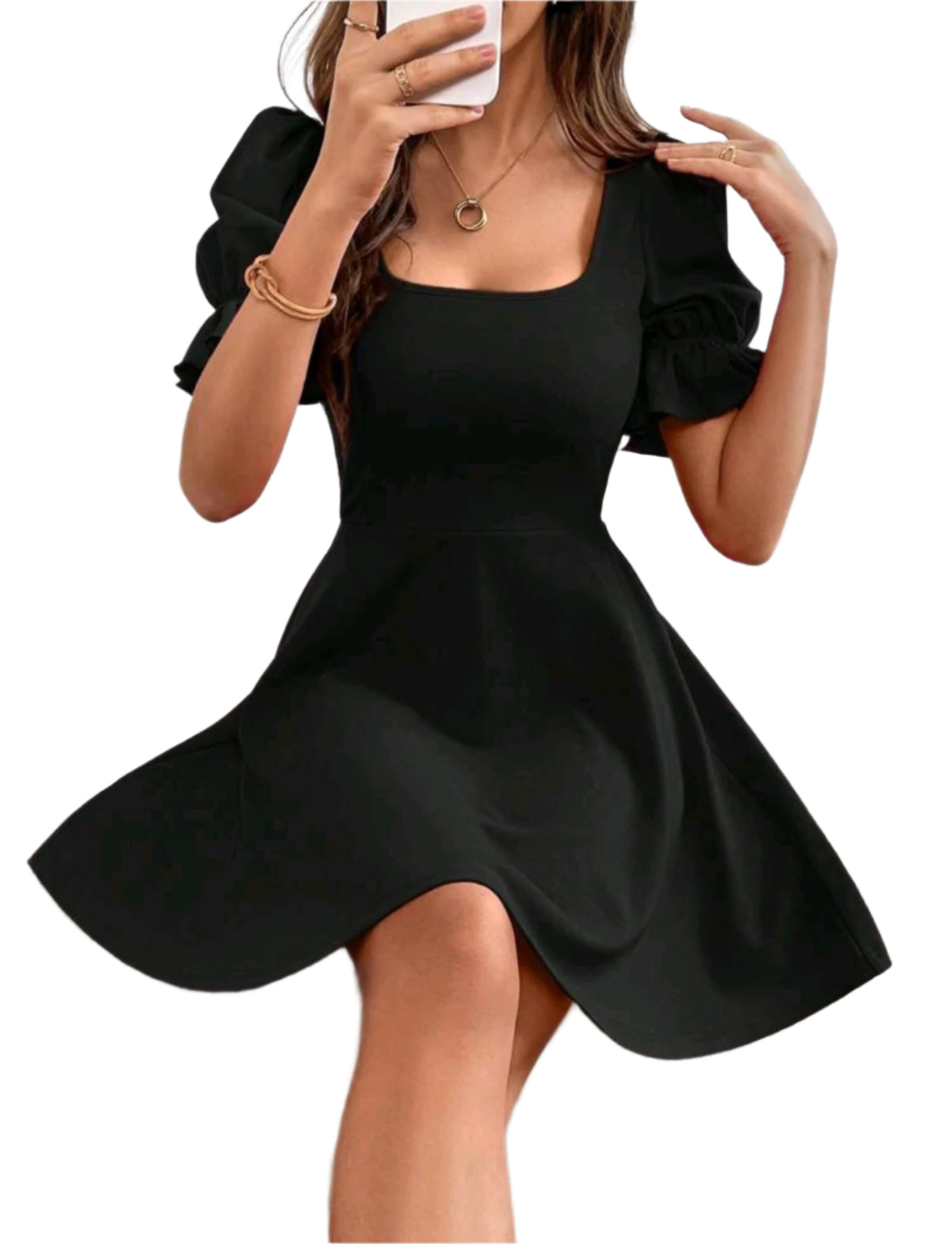 Címke nélküli, női ruha, fekete színű, elegáns és nőies kialakítással. Négyzet alakú nyakkivágással, rövid puffos ujjakkal és karcsúsított derékrésszel. A-vonalú, lendületes szoknyarésszel, amely kiemeli az alakot. Kényelmes és elegáns viselet, tökéletes alkalmi és esti megjelenéshez.