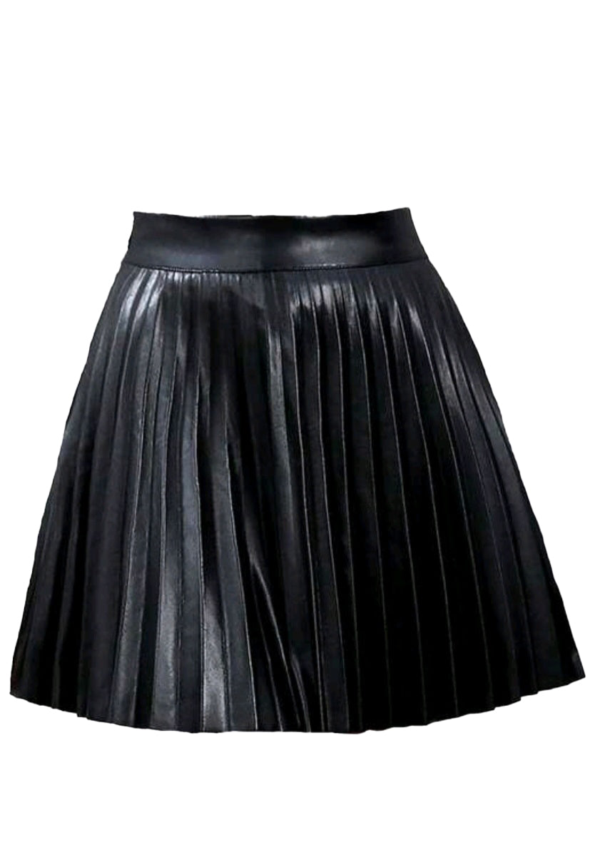 Címke nélküli, fekete műbőr hatású rakott szoknya, amely elegáns és vagány megjelenést biztosít. Magas derekú kialakításának köszönhetően kiemeli az alakot, míg a pliszírozott szabás lendületes, modern hatást kölcsönöz. Tökéletes választás hétköznapi viselethez, bulikhoz vagy különleges alkalmakra.