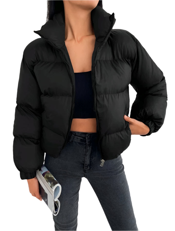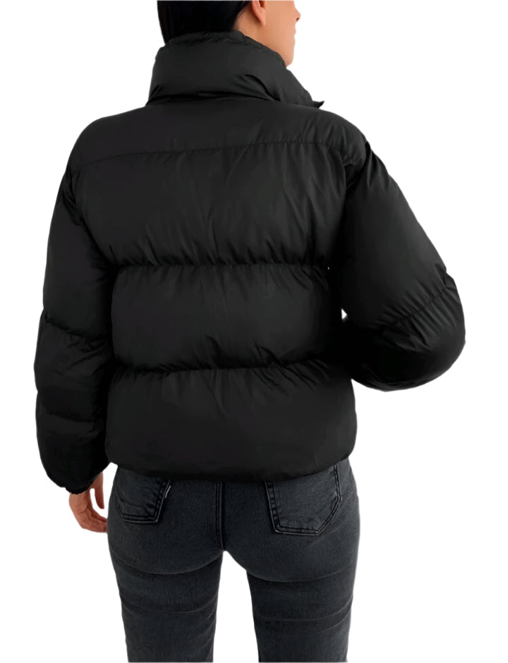 Címke nélküli, divatos fekete rövid pufi dzseki. Letisztult, minimalista design, magas gallérral és cipzáras záródással. Kényelmes és meleg viselet a hidegebb napokra, tökéletes választás sportos és hétköznapi outfitekhez.