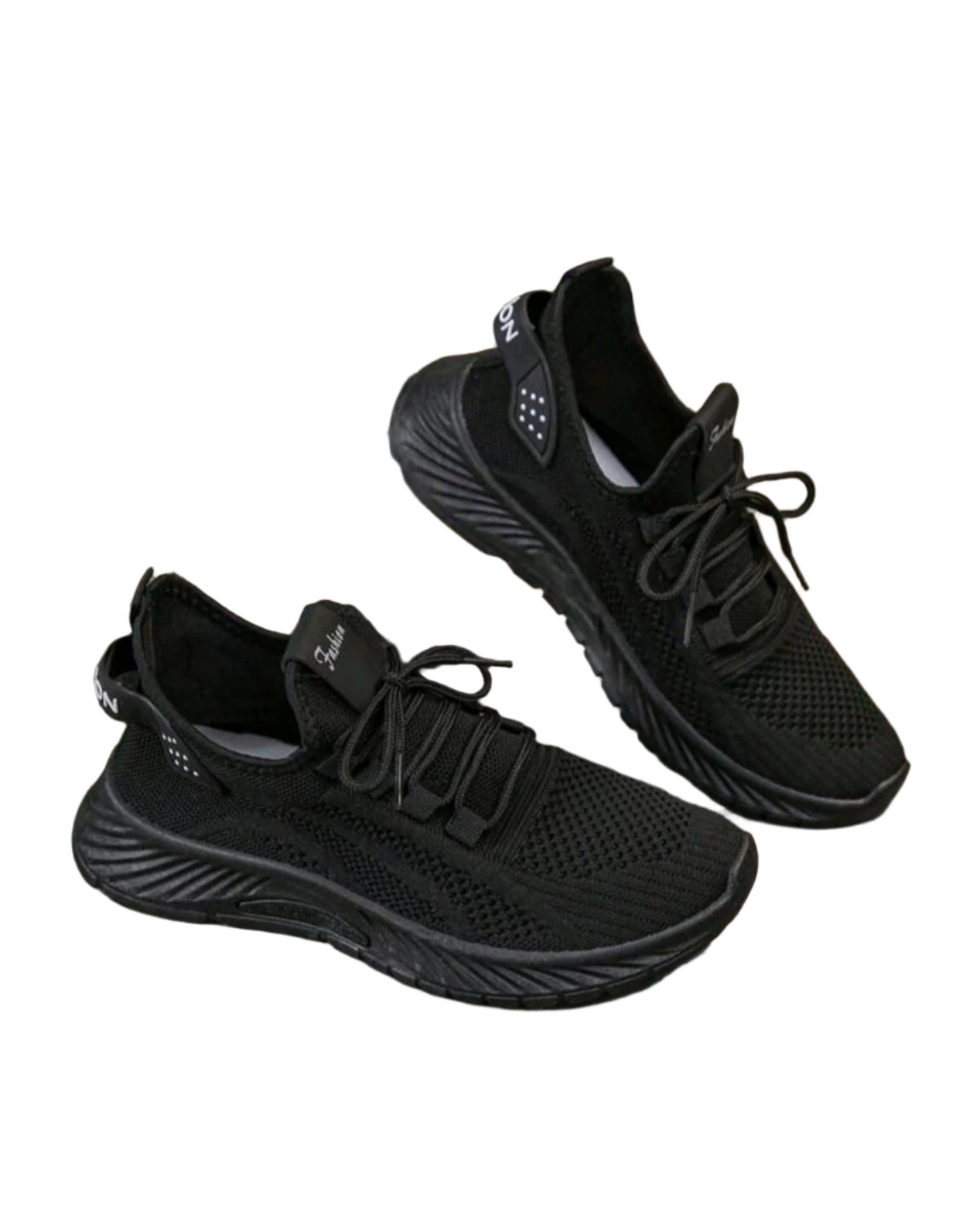 Címke nélküli, letisztult fekete sportcipő légáteresztő, könnyű hálós anyagból. Fűzős kialakításának köszönhetően stabil tartást biztosít, míg a vastag, ergonomikus talpa extra kényelmet nyújt. Ideális mindennapi viseletre, sportoláshoz és aktív életmódhoz.