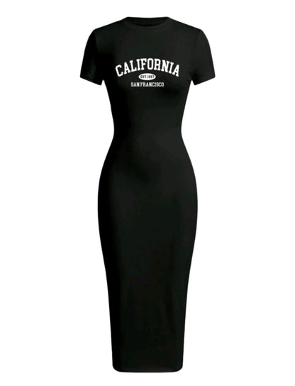 Címke nélküli, fekete, testhez simuló, rugalmas anyagú ruha sportos stílusban. Rövid ujjú, kerek nyakú fazon "CALIFORNIA SAN FRANCISCO" felirattal a mellrészen. Kényelmes viselet a mindennapokra, utcai vagy laza alkalmi outfitekhez.