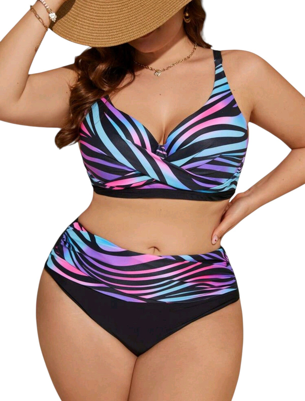 Címke nélküli, fekete, színátmenetes csíkos, plus size, kétrészes, V-nyakkivágás, széles pánt, magasított derékrész, csavart részlet elöl.