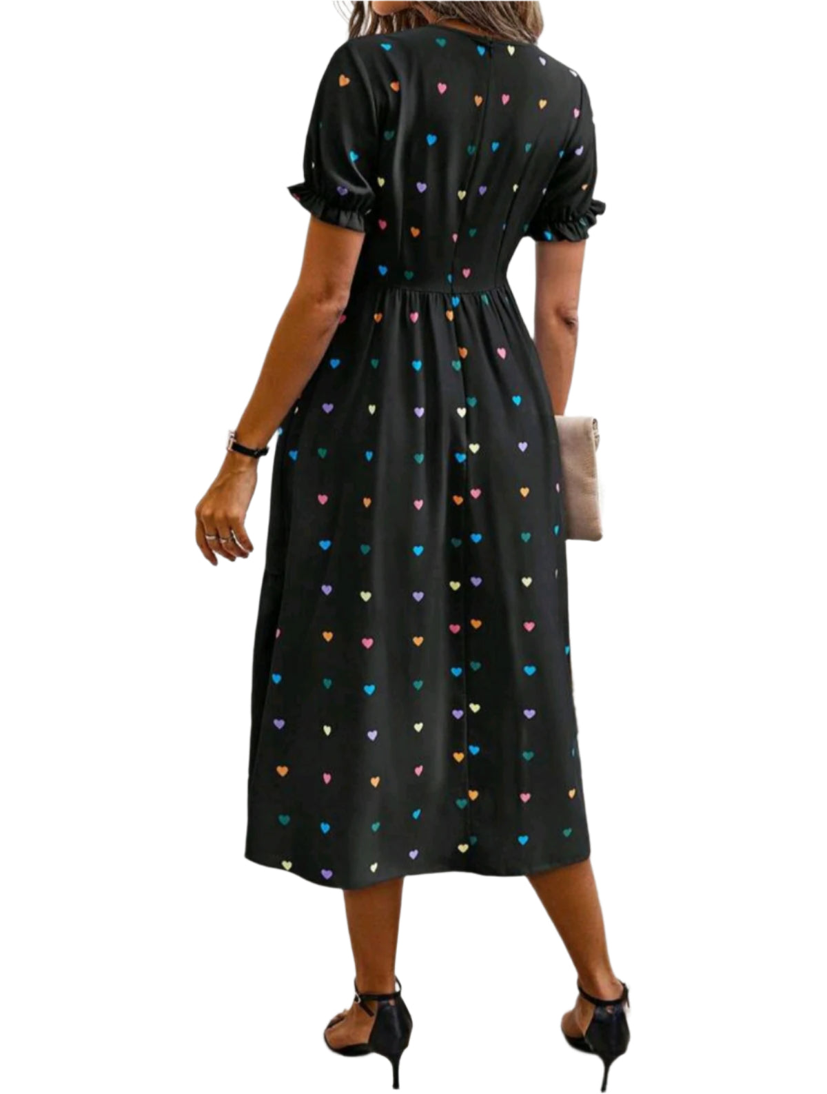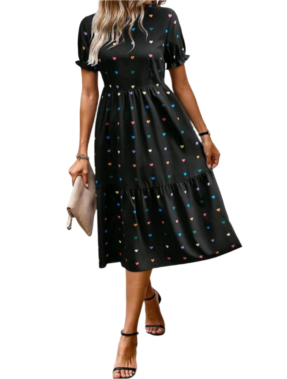 Címke nélküli, női ruha, nyári, fekete alapon színes szívecske mintákkal, rövid ujjal, kerek nyakkivágással, magasított derékrésszel, bő, rétegesen szabott midihosszal, könnyű és kényelmes anyagból, ideális hétköznapi viseletre vagy baráti összejövetelekre.