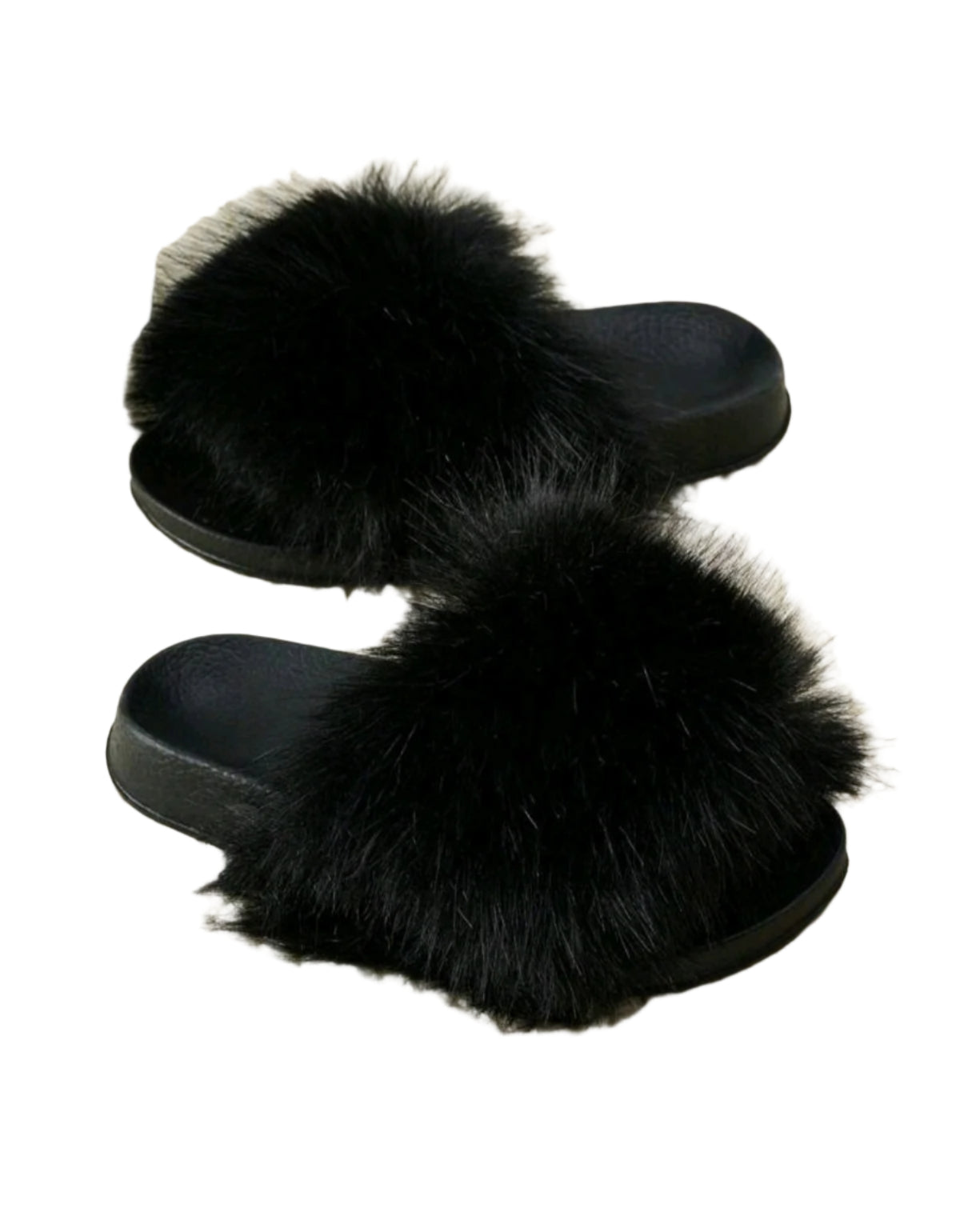 Címke nélküli, kényelmes fekete szőrös papucs, amely ideális otthoni viselethez vagy divatos nyári outfitek kiegészítéséhez. Puha, bolyhos pántja stílusos megjelenést biztosít, míg a strapabíró talp kényelmes viseletet garantál. Könnyen kombinálható lezser és trendi összeállításokkal egyaránt.