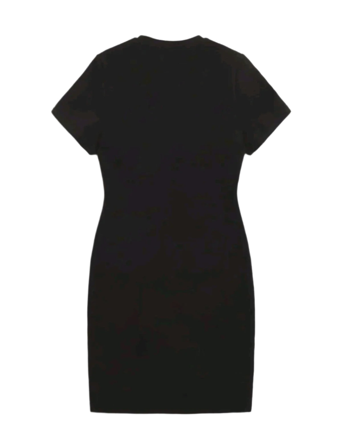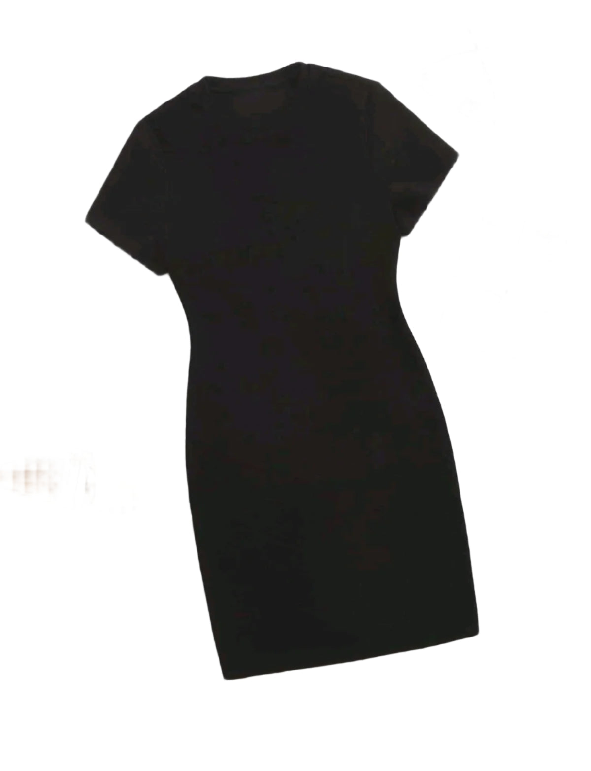 Címke nélküli, fekete testhezálló mini ruha, rövid ujjakkal és kerek nyakkivágással. Letisztult, minimalista dizájn, rugalmas anyagból készült, amely kiemeli az alakot. Tökéletes hétköznapi viseletként vagy rétegezéshez.