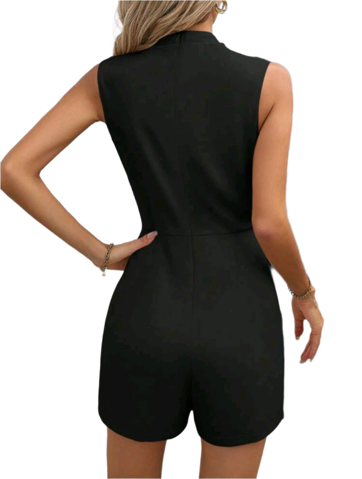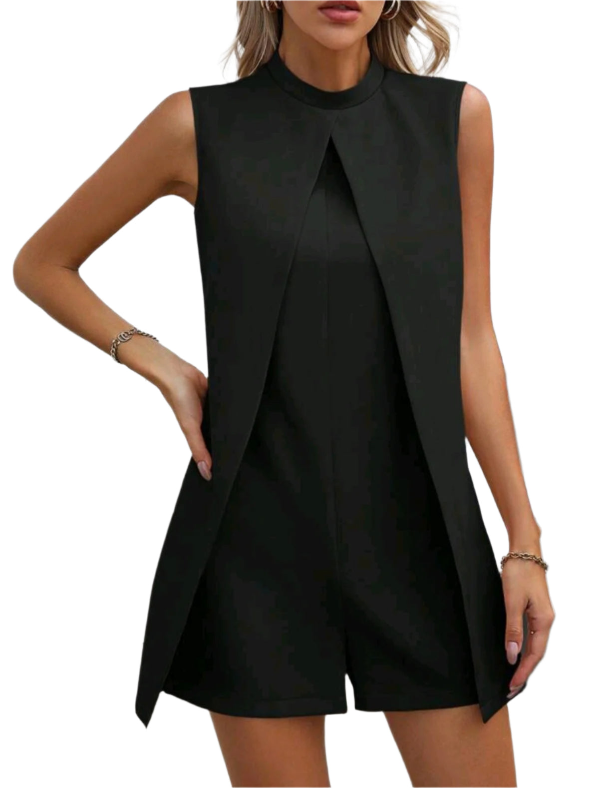 Címke nélküli, fekete, ujjatlan overál elegáns, hosszított mellrész kialakítással, amely modern, szinte mellényre emlékeztető hatást kelt. Magas nyakkivágása és letisztult szabása különleges, mégis visszafogott megjelenést biztosít. Ideális választás irodai viselethez, üzleti eseményekhez vagy esti alkalmakra.