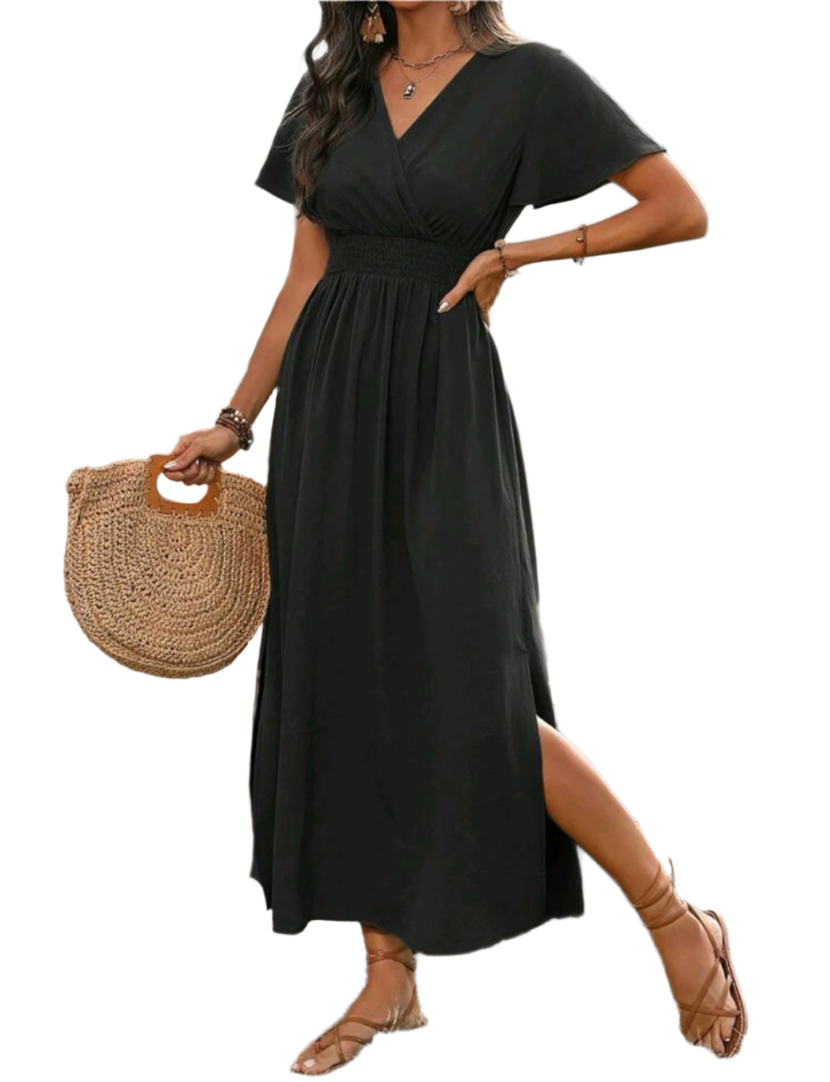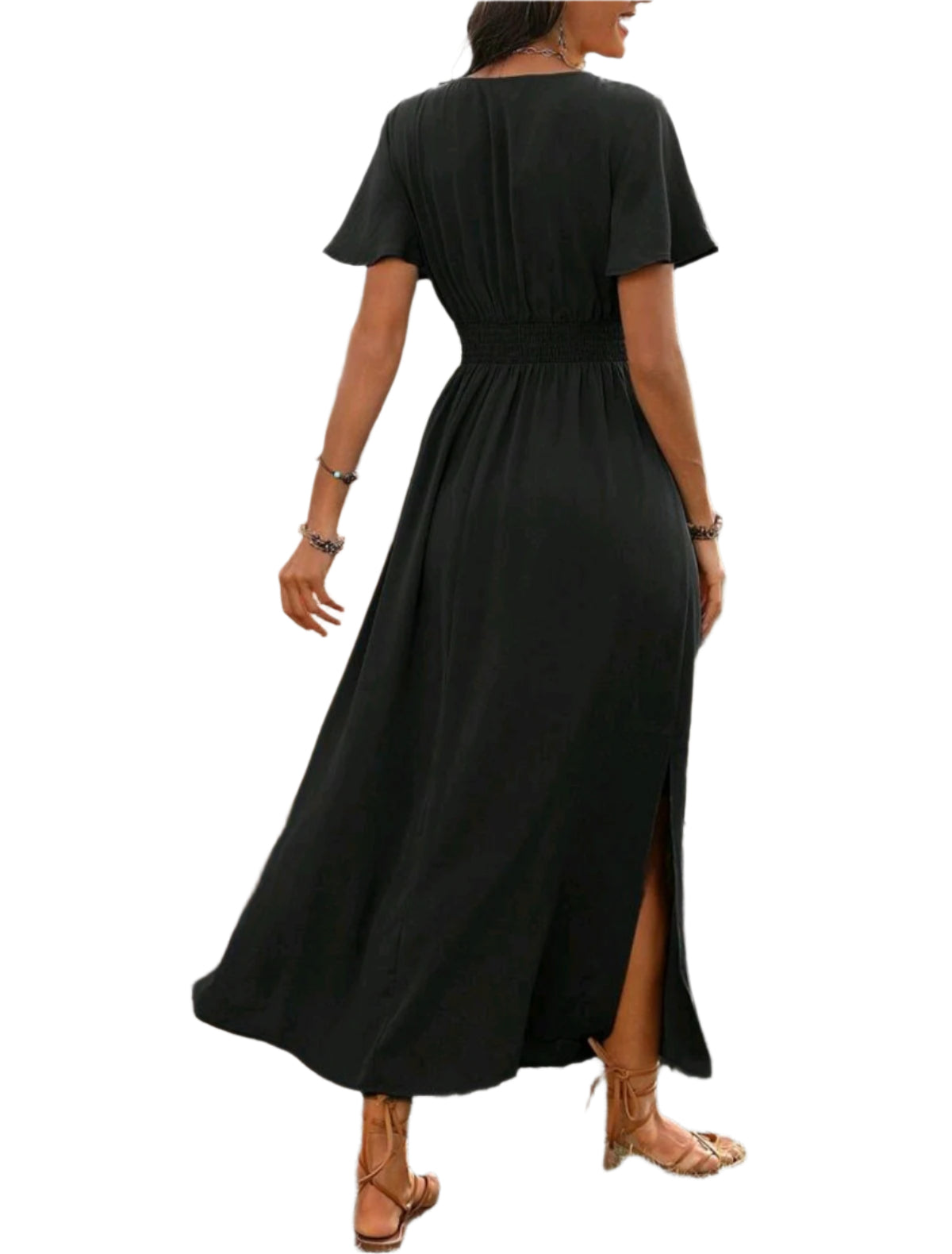 Címke nélküli, női fekete maxi ruha V-nyakkivágással és rövid, bő szabású ujjakkal. Rugalmas derékrész kiemeli az alakot, lágy esésű, könnyed anyagból készült. Oldalt felsliccelt szoknyarész, amely kényelmes mozgást biztosít. Elegáns és bohém stílusú viselet hétköznapokra és különleges alkalmakra egyaránt.