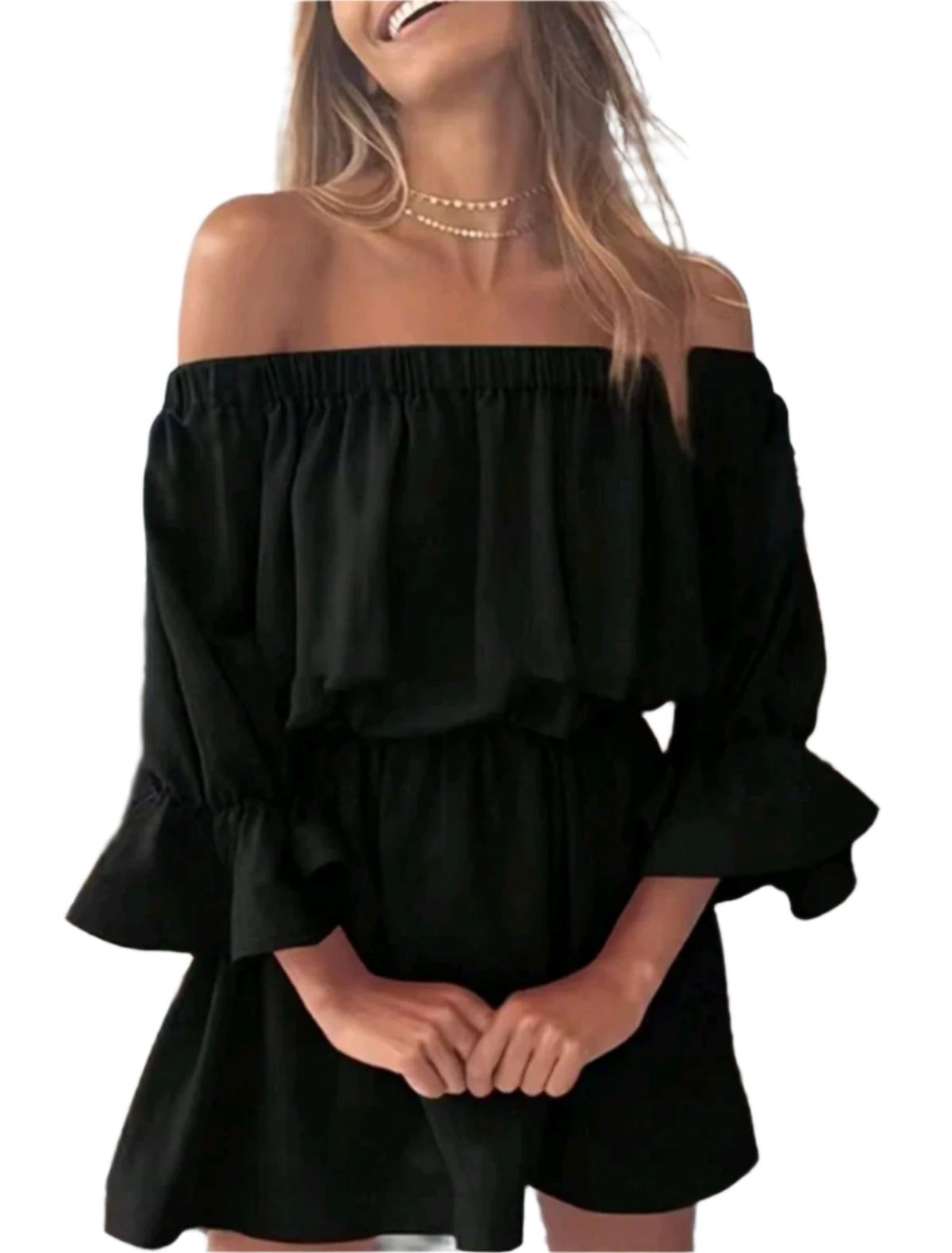 Címke nélküli, női miniruha, fekete színű, váll nélküli kialakítással. Gumírozott felsőrész és derékrész, laza, bő szabás, hosszú, harang fazonú ujjakkal és fodros szegéllyel. Könnyed, nőies viselet, tökéletes nyári estékhez és elegáns alkalmakra.
