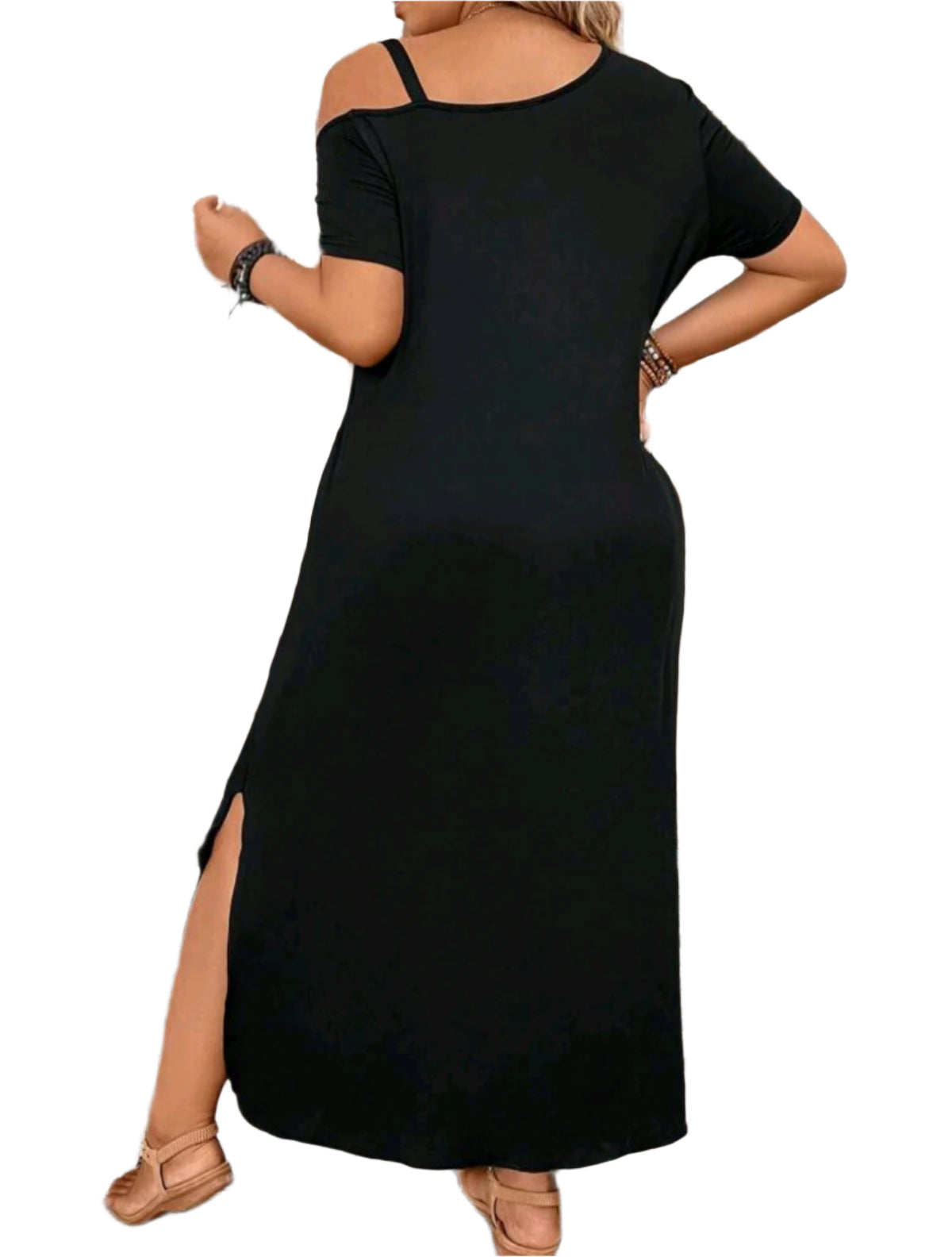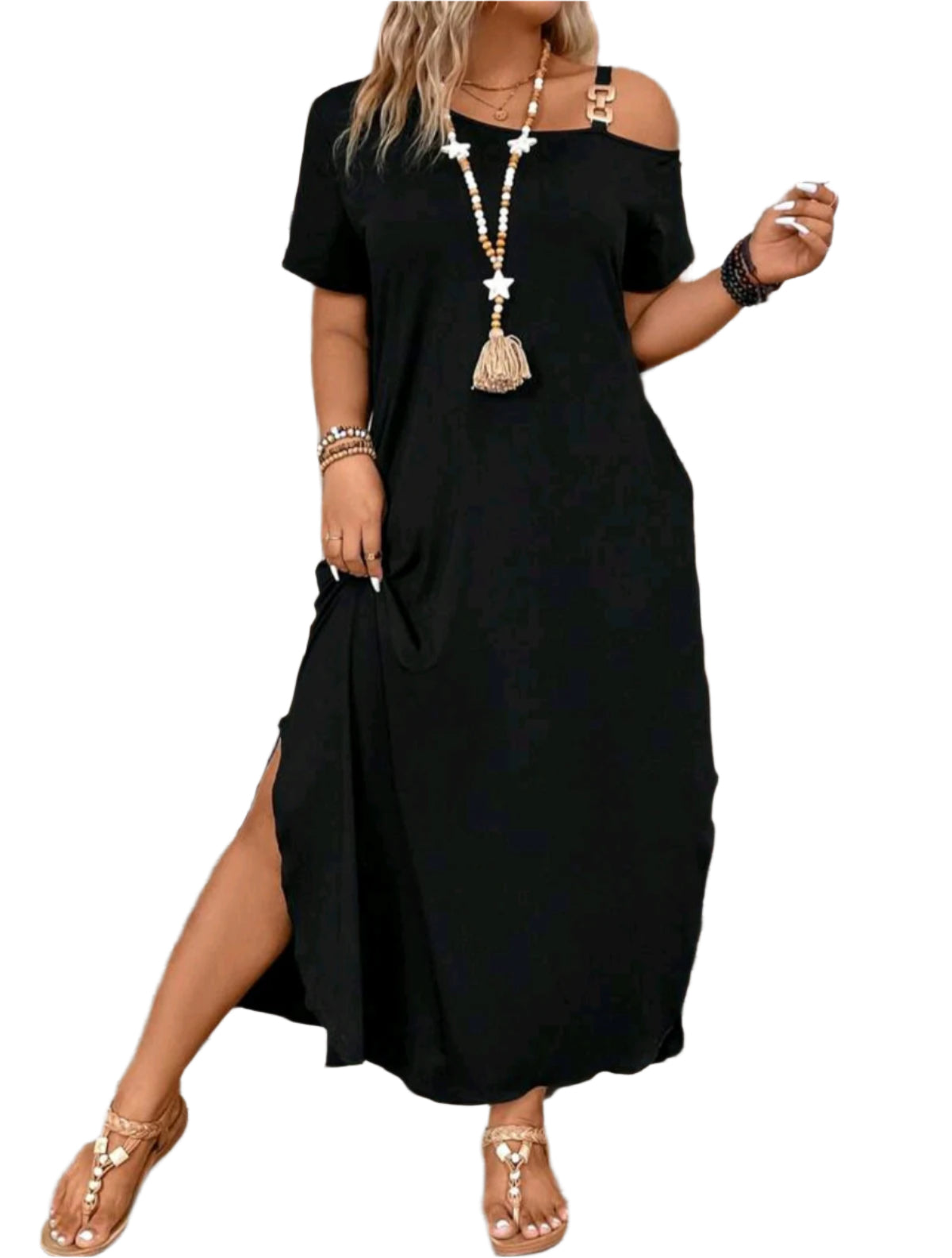 Címke nélküli, fekete színű, lezser szabású ruha dekoratív fémes vállpánttal és ejtett vállmegoldással. Oldalt felvágott szegéllyel és kényelmes rövid ujjal készült, így ideális választás nyári sétákhoz vagy strandoláshoz. A laza szabás remek komfortot biztosít egész nap.