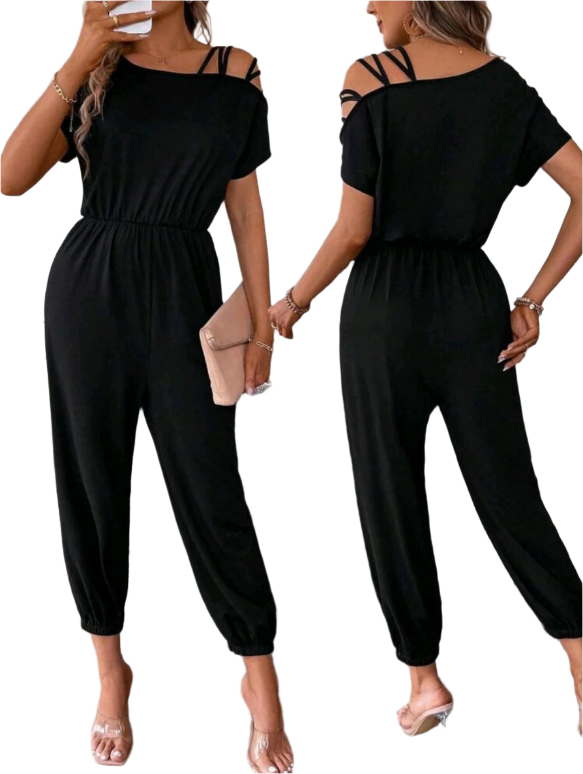 Címke nélküli, puha anyagú, kényelmes szabású overál, ejtett vállmegoldással és több vékony pánttal a vállrészen. A derékban gumírozott kialakítás kiemeli az alakot, míg a bokában szűkített nadrágszár sportosan nőies megjelenést biztosít. Ideális választás hétköznapokra, utazáshoz vagy lazább programokra.