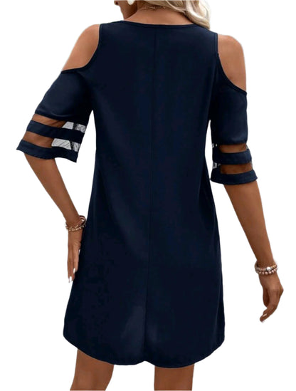 Címke nélküli, könnyed anyagú, rövid fazonú ruha V-nyakkivágással és divatos vállkivágással. A félhosszú ujjak áttetsző betétekkel díszítettek, amelyek modern és nőies megjelenést kölcsönöznek. Tökéletes választás nyári programokra vagy esti sétákhoz.