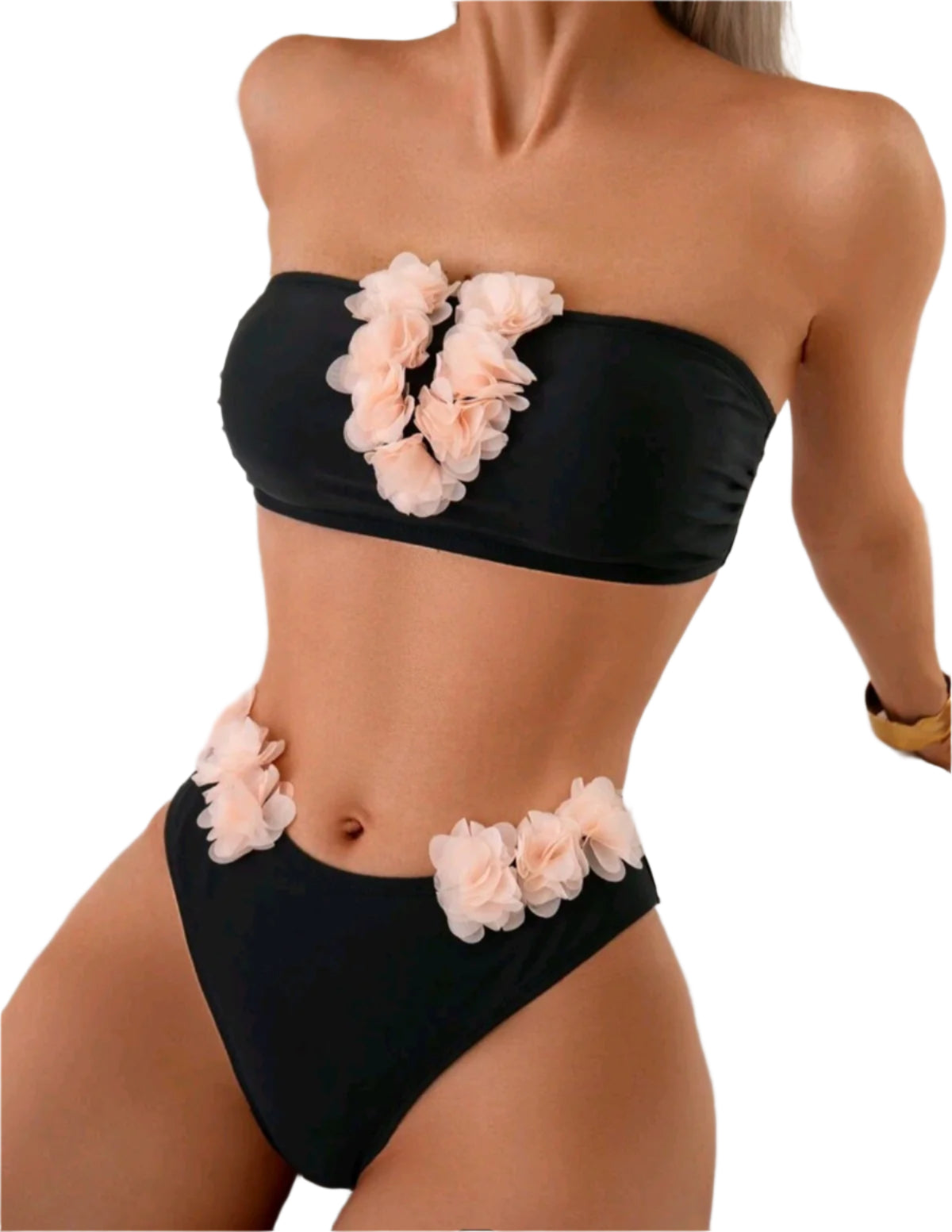 Címke nélküli, elegáns fekete bandeau fazonú bikini, bájos virágdíszítéssel. A pánt nélküli felsőrész V-alakban elhelyezett, halvány rózsaszín 3D virágokkal díszített, míg az alsórészen oldalt található hasonló virágapplikációk nőies és romantikus megjelenést biztosítanak. Tökéletes választás napozáshoz vagy különleges strandos alkalmakra.