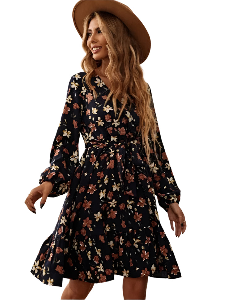Címke nélküli, fekete alapon virágmintás, bohém stílusú bő szabású ruha. Hosszú, enyhén puffos ujjakkal és gumírozott mandzsettával készült, V-kivágású felsőrésze nőies és kényelmes viseletet biztosít. A derékban megkötős szabás kiemeli az alakot, míg az alsó fodros rész játékos és légies megjelenést ad. Ideális választás hétköznapi viseletre, tavaszi és őszi sétákhoz, vagy bohém stílus kedvelőinek.