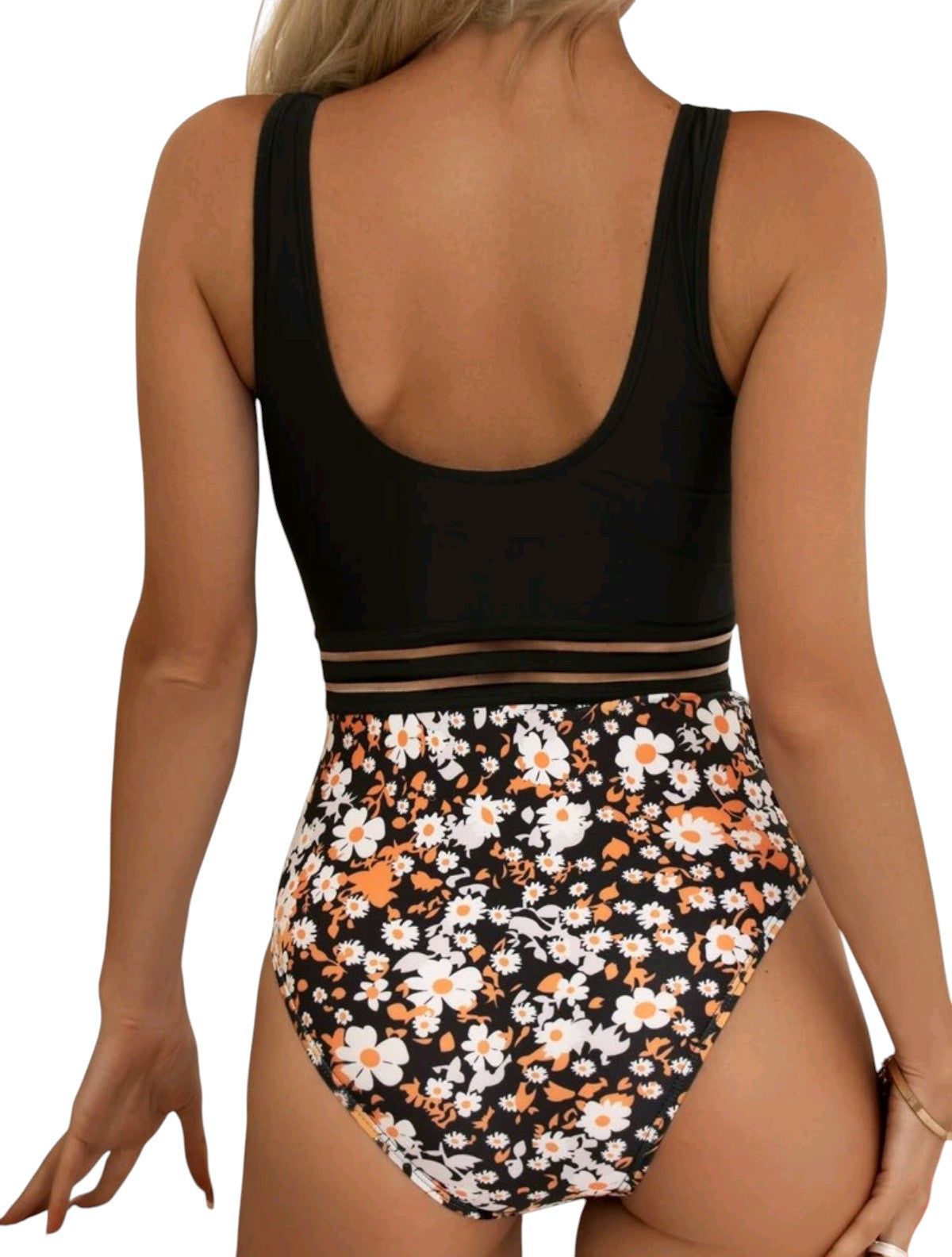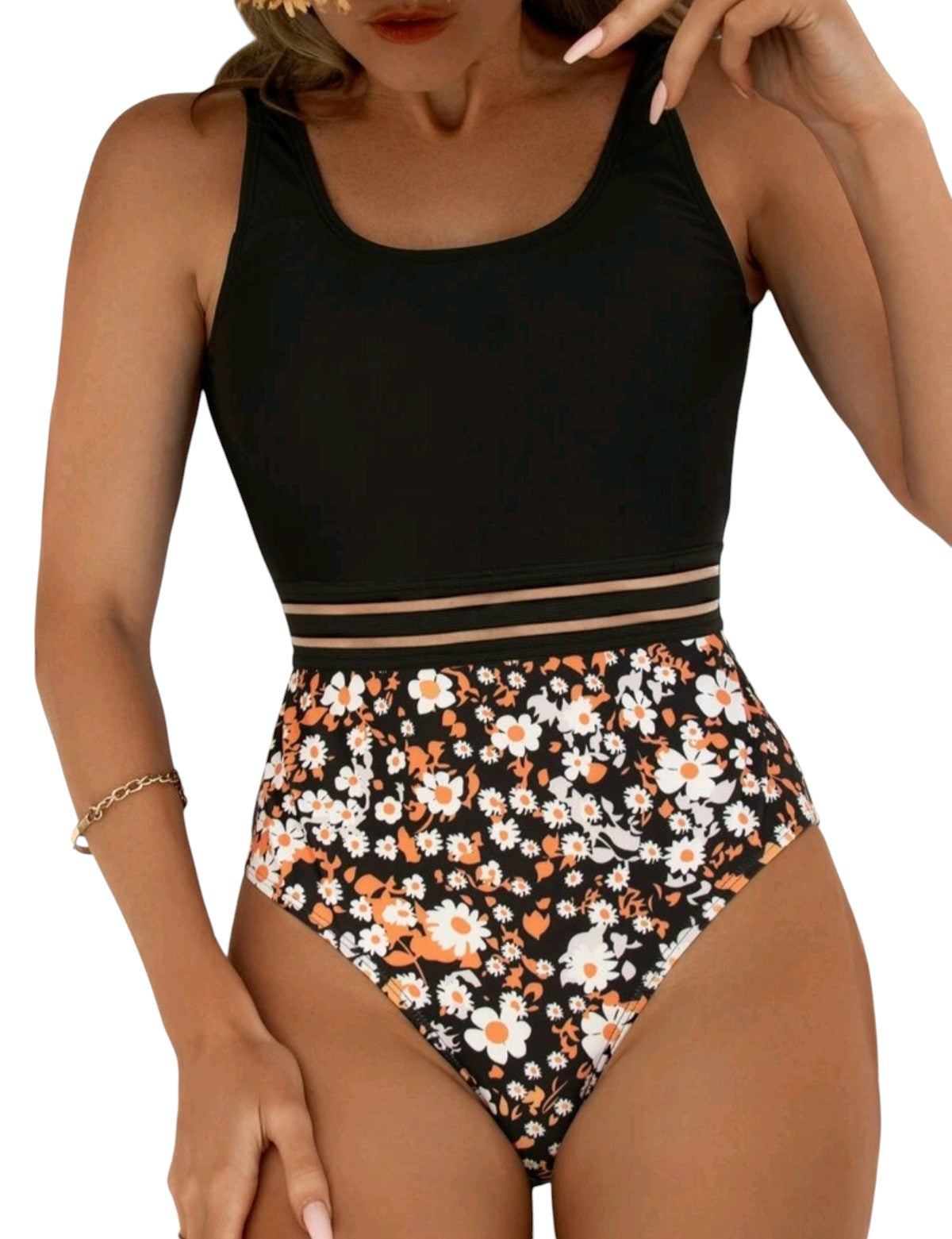 SHE fekete virágmintás magasderekú egyrészes fürdőruha