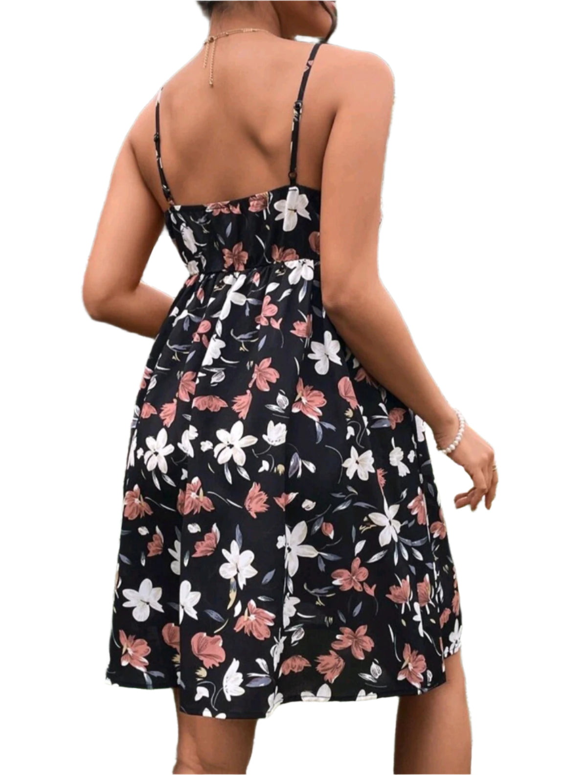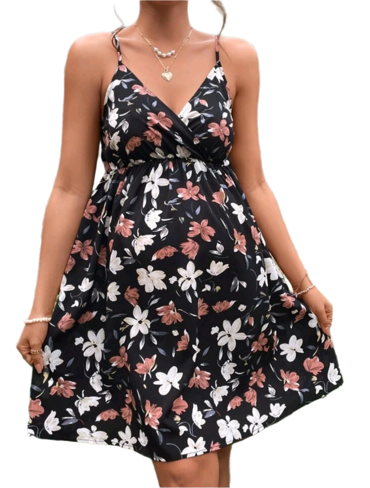 Címke nélküli, könnyed nyári ruha, amely romantikus és nőies megjelenést biztosít. V-kivágású, keresztpántos mellrész kiemeli a dekoltázst, míg a derékrész alatt bővülő fazon kényelmes viseletet nyújt. Állítható spagettipántokkal rendelkezik, így testreszabható a tökéletes illeszkedés érdekében. Légies, virágmintás anyaga ideális választás tavaszi és nyári alkalmakra, legyen szó egy kerti partiról vagy egy hétköznapi sétáról.