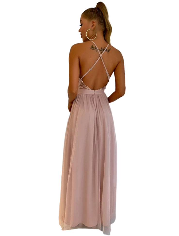 Címke nélküli, lenyűgöző flitteres felsőrésszel és könnyed tüll szoknyával készült estélyi ruha. A mély dekoltázs és az oldalsó slicc nőies és elegáns megjelenést biztosít. Tökéletes választás esküvőre, bálra vagy különleges alkalmakra.