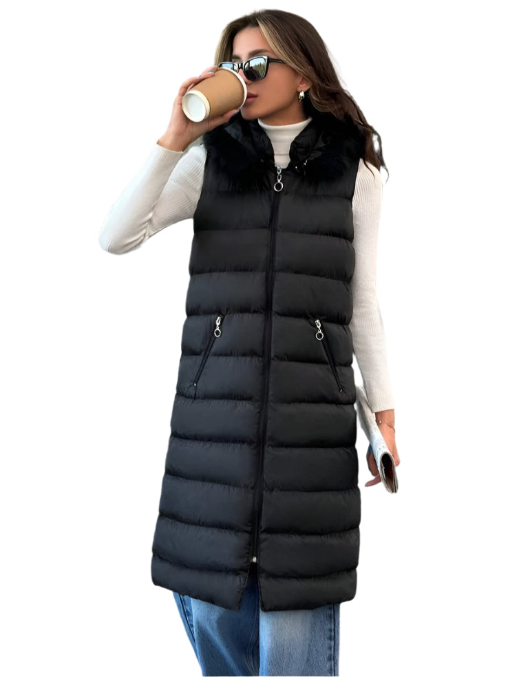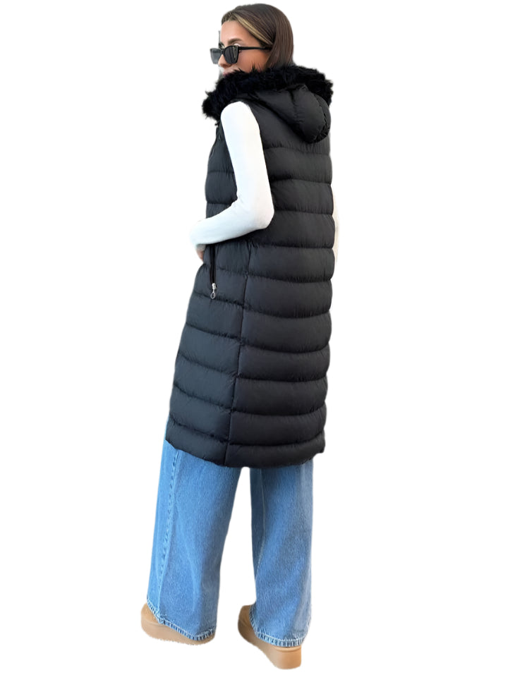 Címke nélküli, hosszú steppelt mellény, amely kényelmes és modern megjelenést kölcsönöz. Könnyű és praktikus viselet a hűvösebb napokra.