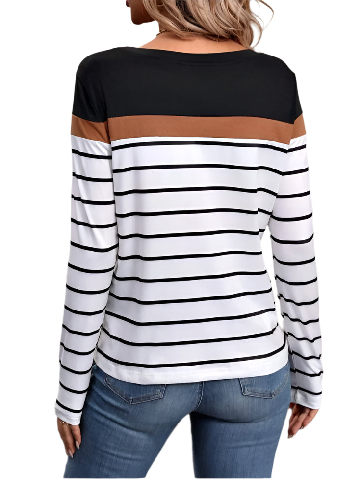 Címke nélküli, laza fazon, kerek nyakkivágással. Klasszikus csíkos minta kontrasztos fekete és barna színblokkokkal. Puha, kényelmes anyag, amely tökéletes hétköznapi viselethez. Letisztult, mégis stílusos darab, amely könnyen kombinálható farmerrel vagy elegánsabb nadrággal is.