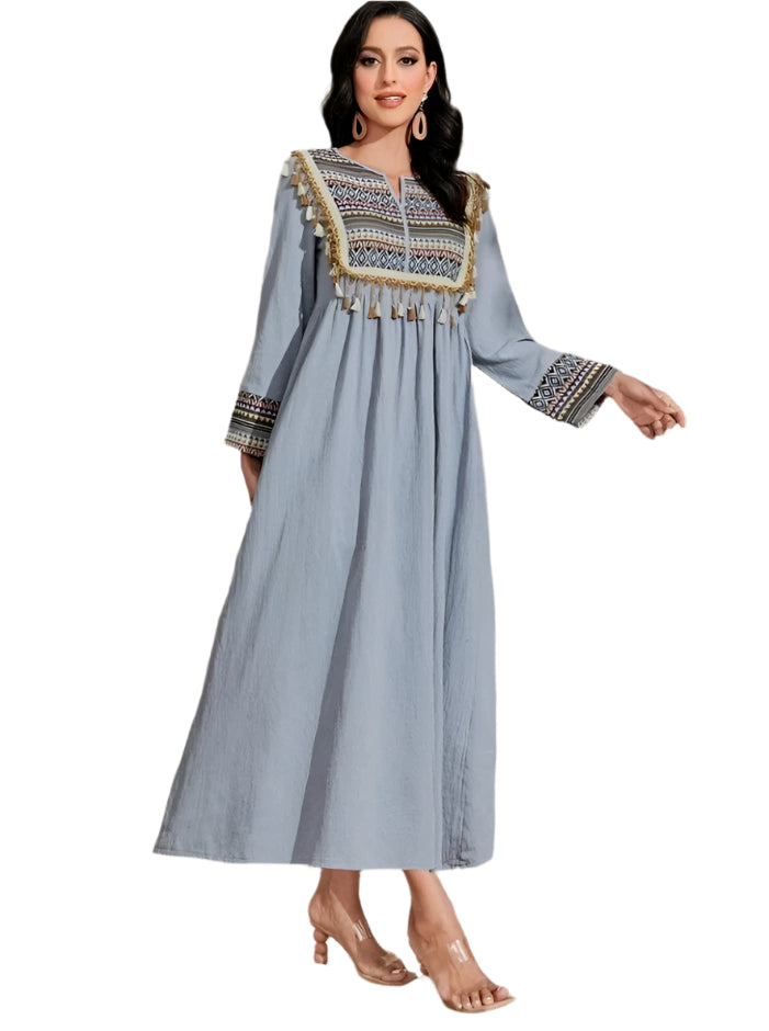 Címke nélküli, kék, bohém stílusú maxi ruha, gazdagon hímzett felsőrésszel és rojtokkal díszítve. Laza, bő szabása könnyed és kényelmes viseletet biztosít, míg a hosszú ujjak és a finoman strukturált anyag légies megjelenést kölcsönöznek. Az etno-mintás díszítés egyedi karaktert ad a ruhának, tökéletes választás nyári sétákhoz, tengerparti nyaraláshoz vagy bohém stílusú alkalmakra.