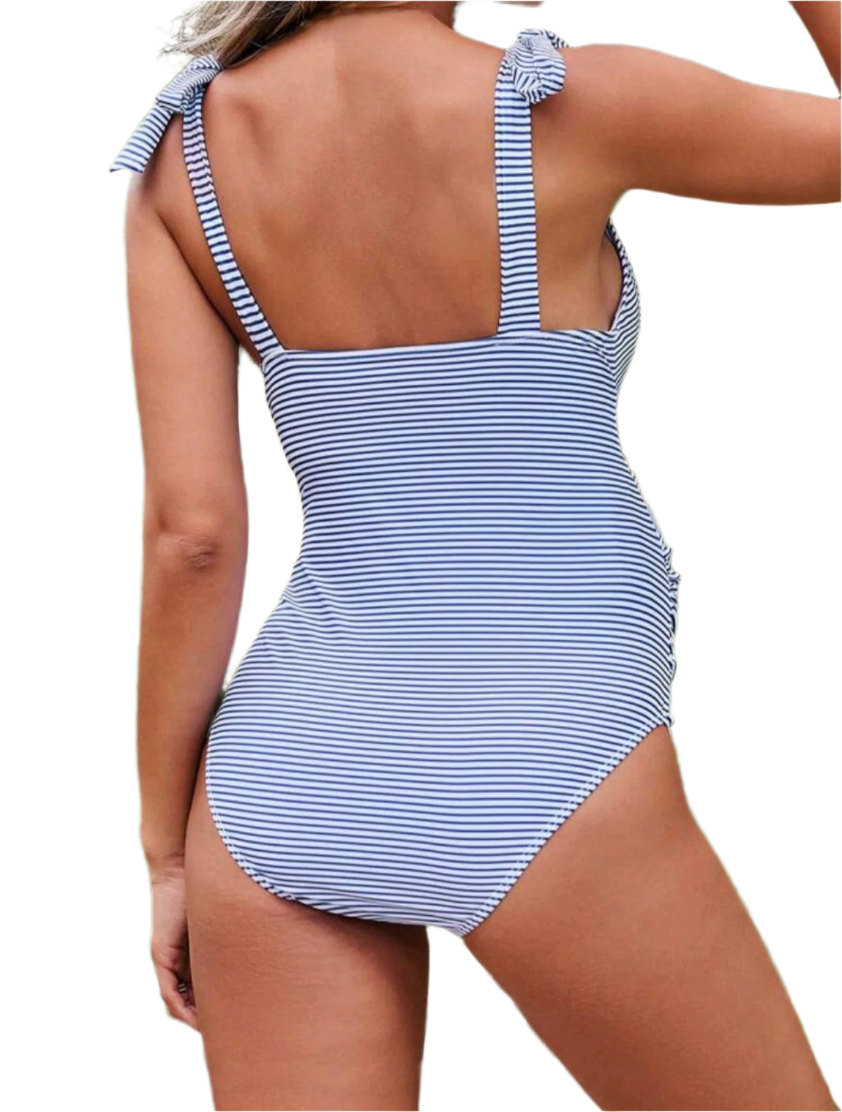 Címke nélküli, női egyrészes fürdőruha, nyári, kismamáknak tervezve, világoskék-fehér vékony csíkos mintával, V-kivágású dekoltázzsal, vállrészen masnis megkötőkkel, pocaknál rugalmas és kényelmes szabással, puha, elasztikus anyagból, ideális várandós nők számára strandoláshoz vagy wellnesshez.