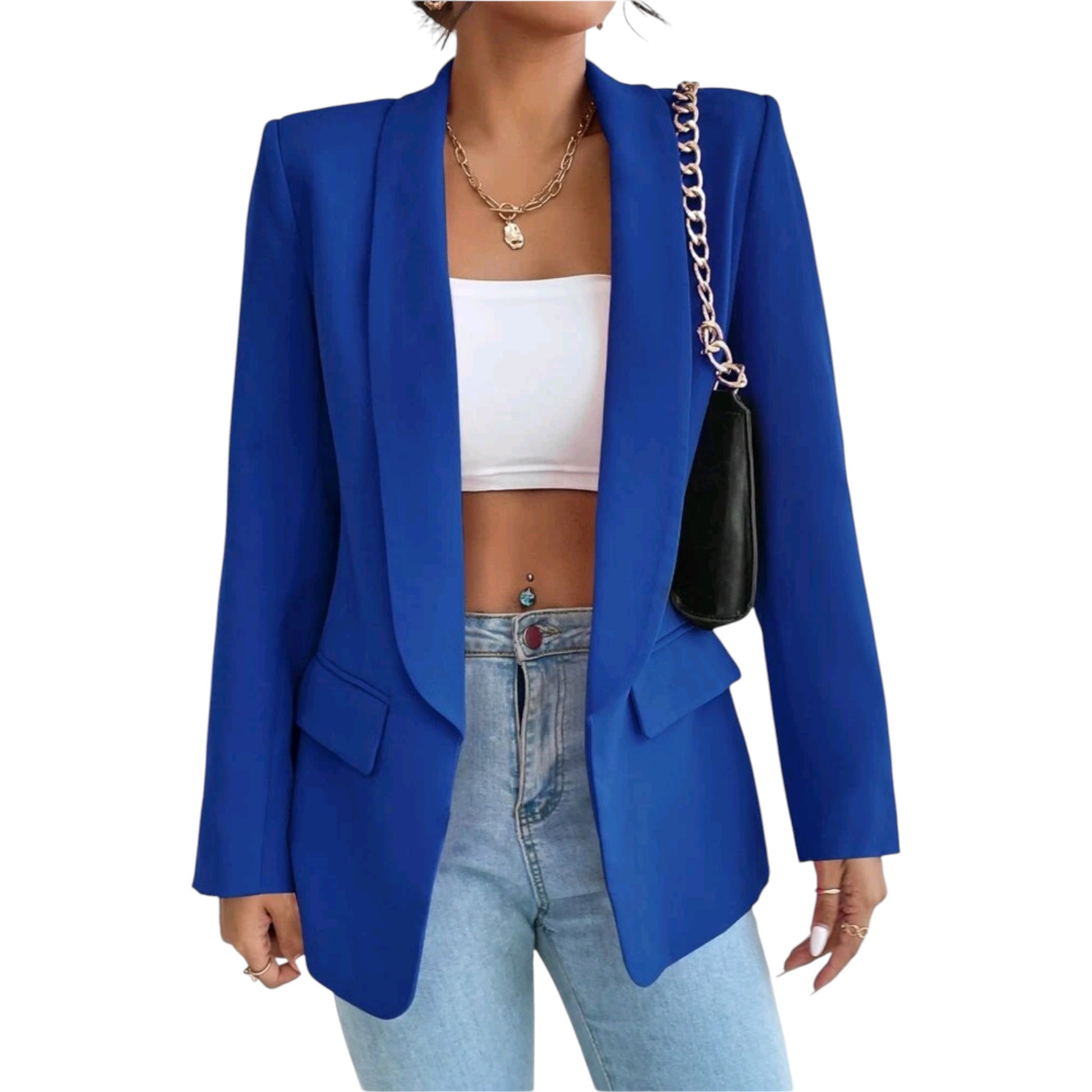 Címke nélküli, kék, elegáns, nyitott fazonú blézer.
