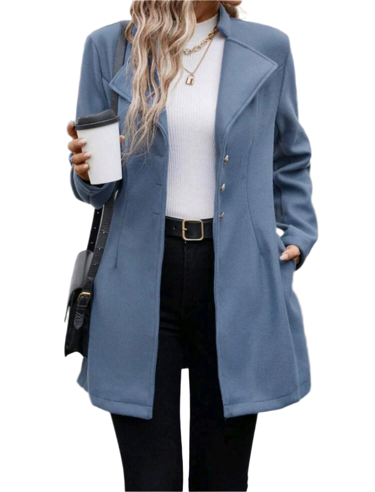 Címke nélküli, stílusos kék kabát elegáns, karcsúsított szabással. Aranyszínű gombokkal díszített, letisztult vonalvezetésű dizájn. Kényelmes viselet tavaszi és őszi időszakban, tökéletes hétköznapi és alkalmi outfitekhez is.