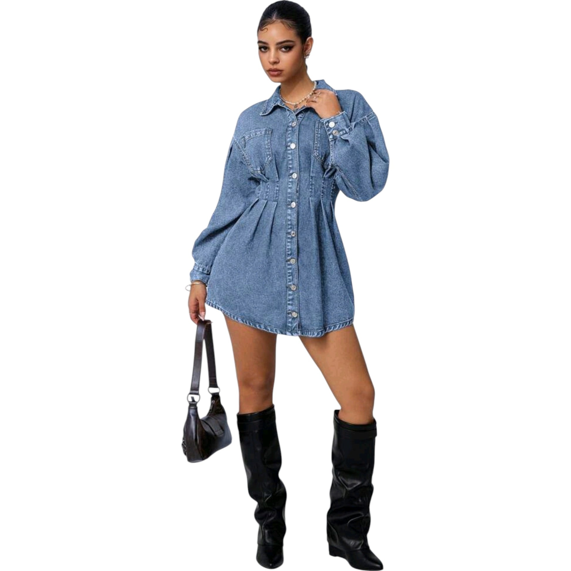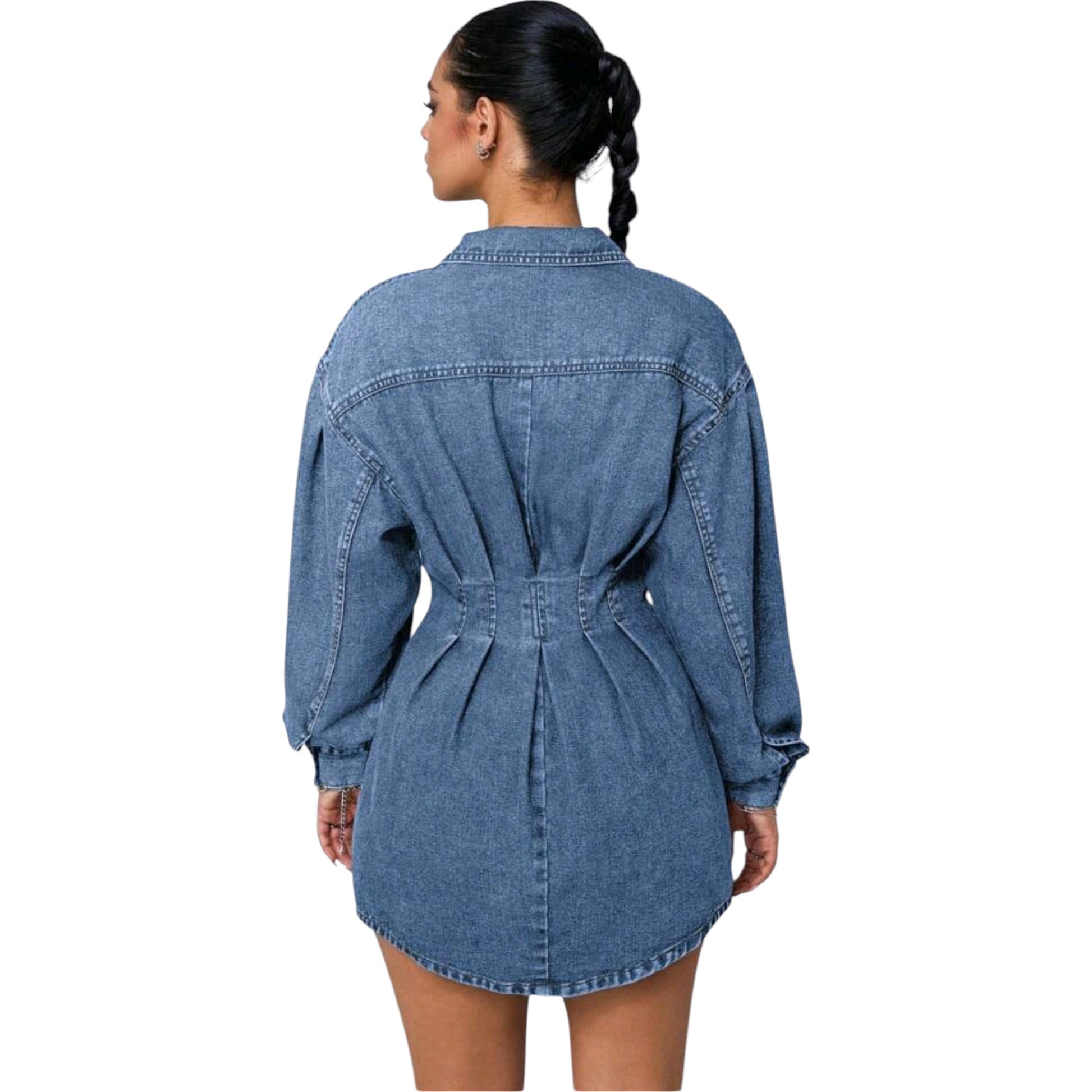 Címke nélküli, kék, farmer, hosszú ujjú, gombos, ráncolt derékrésszel.