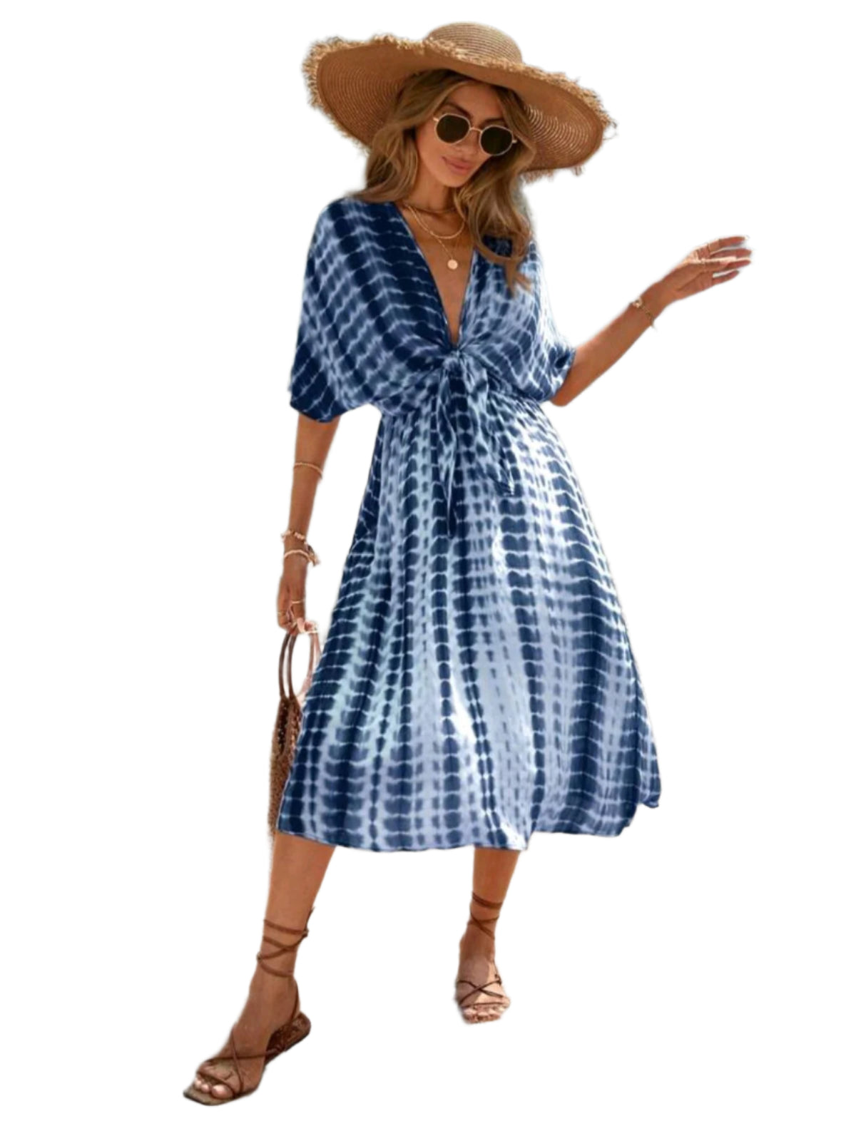 Címke nélküli, női nyári ruha, kék-fehér batikolt mintával. Mély V-nyakkivágású, elöl megkötős kialakítással, bő háromnegyedes ujjakkal és lenge, midi hosszúságú szoknyarésszel. Könnyed és laza viselet, tökéletes tengerparti nyaraláshoz és nyári outfitekhez.