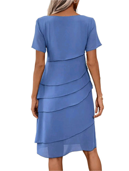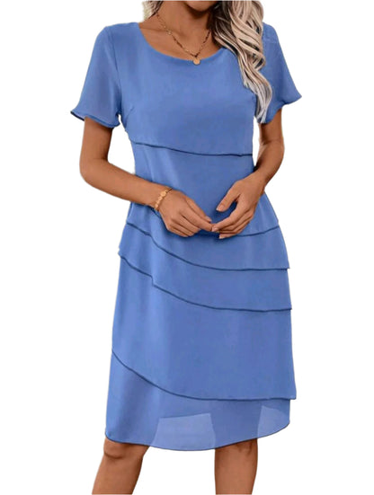Címke nélküli, kék színű, könnyed esésű ruha, rövid ujjal és kerek nyakkivágással. A ruhát több, ferdén szabott fodor díszíti, amelyek réteges hatást keltenek. Térd alá érő fazonja kényelmes és elegáns megjelenést biztosít. Ideális választás hétköznapi vagy alkalmi viseletre.