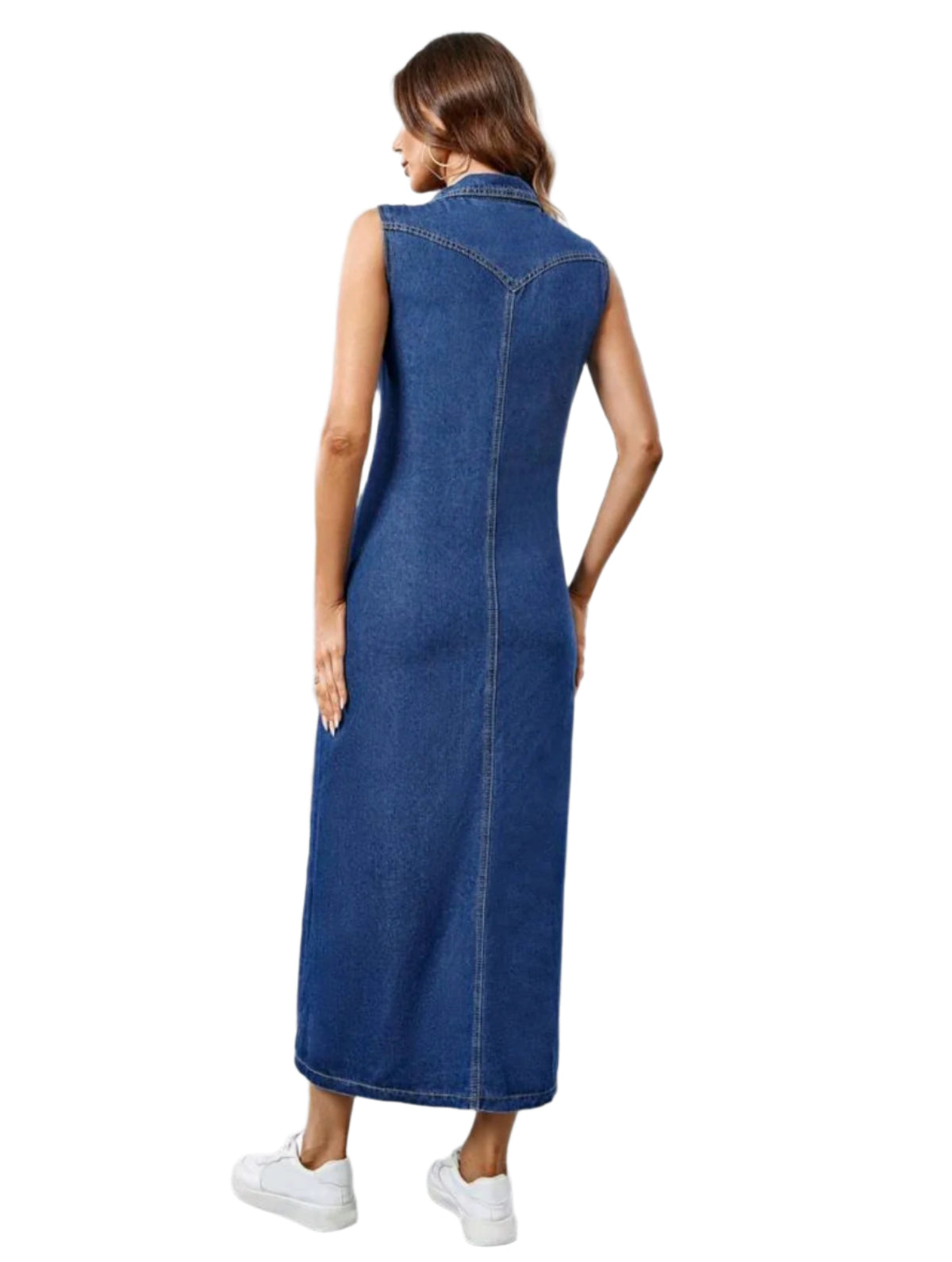 Címke nélküli, klasszikus kék farmer anyagú, ujjatlan maxiruha gallérral és elöl végig gombos záródással. Karcsúsított fazonja és elöl felsliccelt szoknyarésze modern, vagány megjelenést biztosít. Tökéletes választás hétköznapokra, városi sétákhoz vagy egyedi stílusú nyári szettekhez.