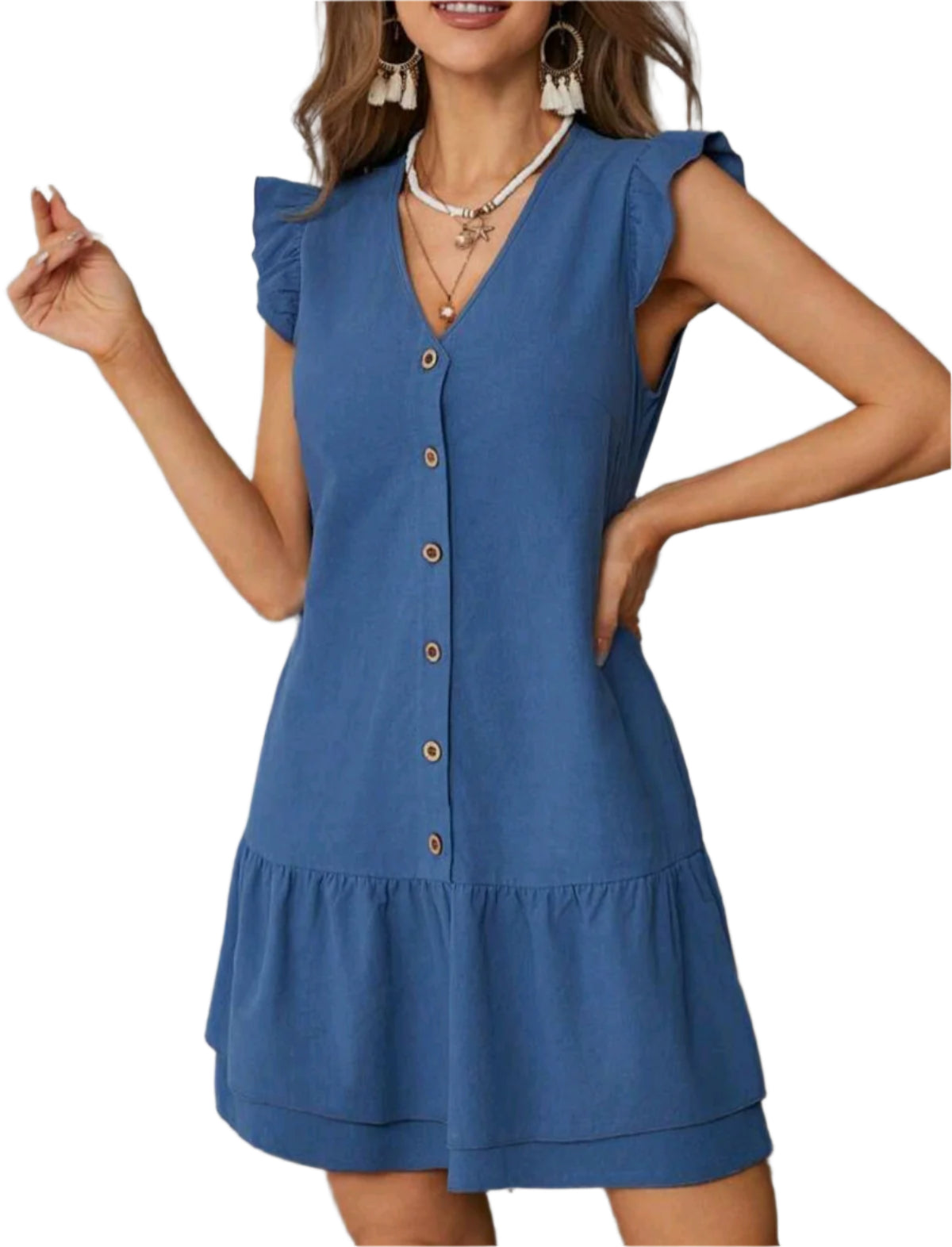 Címke nélküli, kék színű, V-kivágású, ujjatlan ruha fodros vállrésszel és gombos elülső kialakítással. Légies anyaga és fodros alsó része kényelmes és nőies megjelenést biztosít. Tökéletes választás nyári napokra és laza alkalmakra.