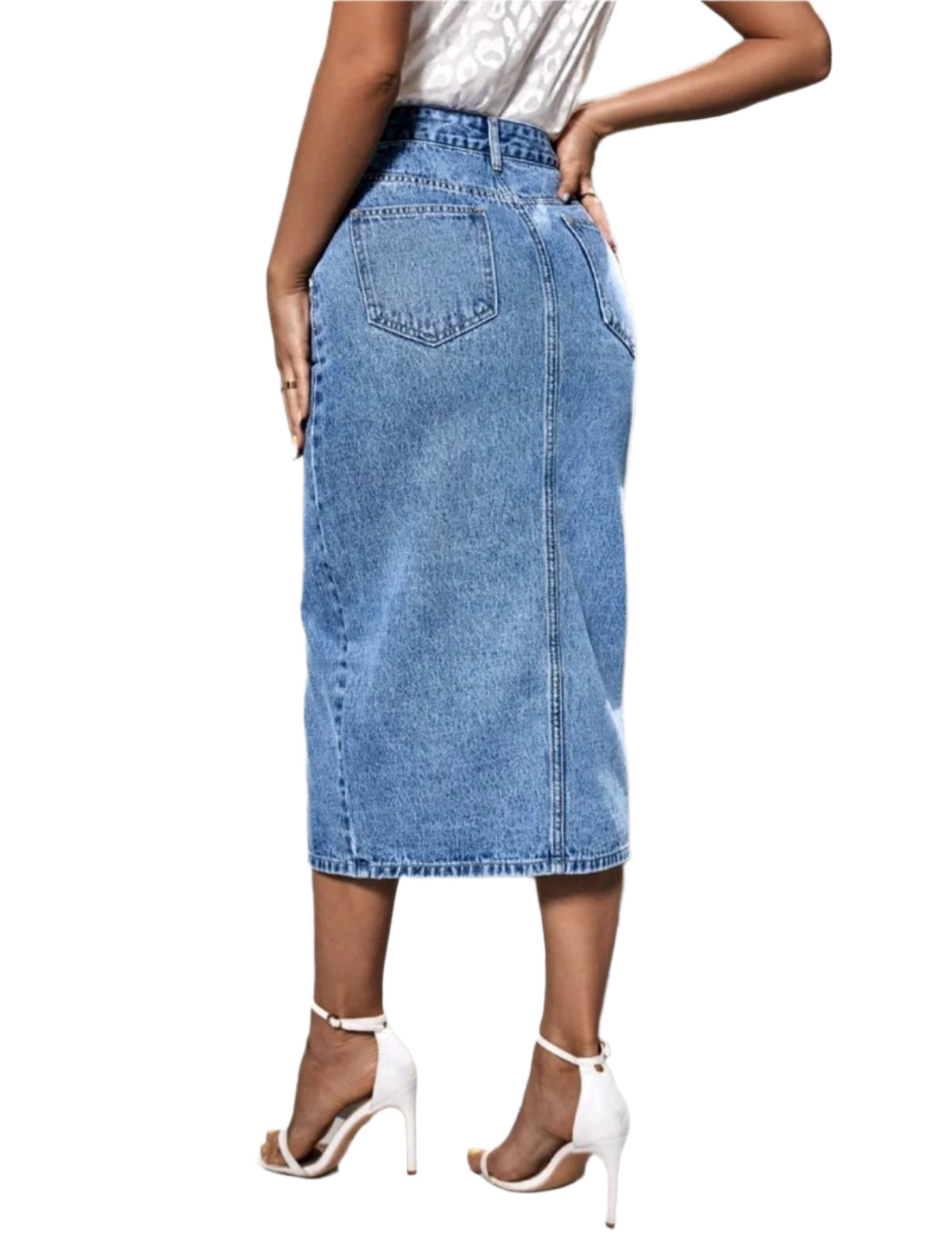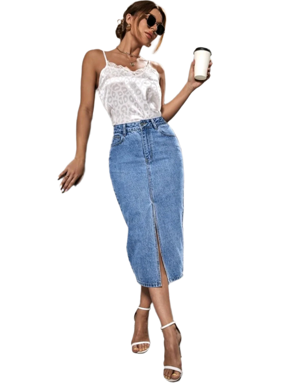 Címke nélküli, klasszikus kék farmer szoknya magas derékkal és elöl hasítékkal a kényelmes mozgásért. Testhezálló fazonjának köszönhetően kiemeli az alakot, miközben a gombos és cipzáras záródás biztosítja a tökéletes illeszkedést. Stílusos és időtálló darab mindennapi és elegáns viselethez egyaránt.