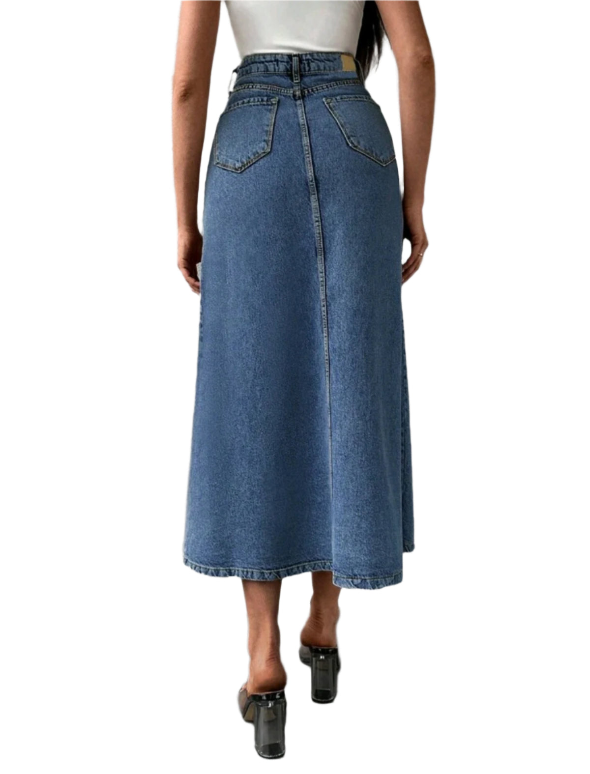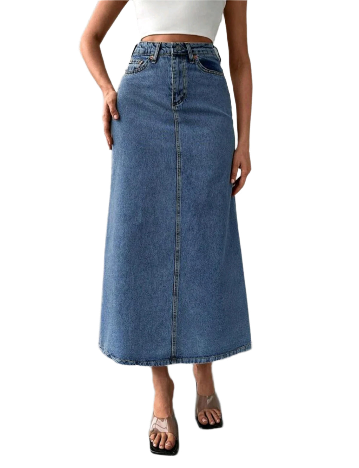 Címke nélküli, klasszikus kék hosszú farmer szoknya egyenes szabással és magas derékkal. Kényelmes és időtlen darab, amely könnyedén kombinálható különböző felsőkkel. Gombos és cipzáras záródás, valamint praktikus elülső és hátsó zsebekkel rendelkezik.