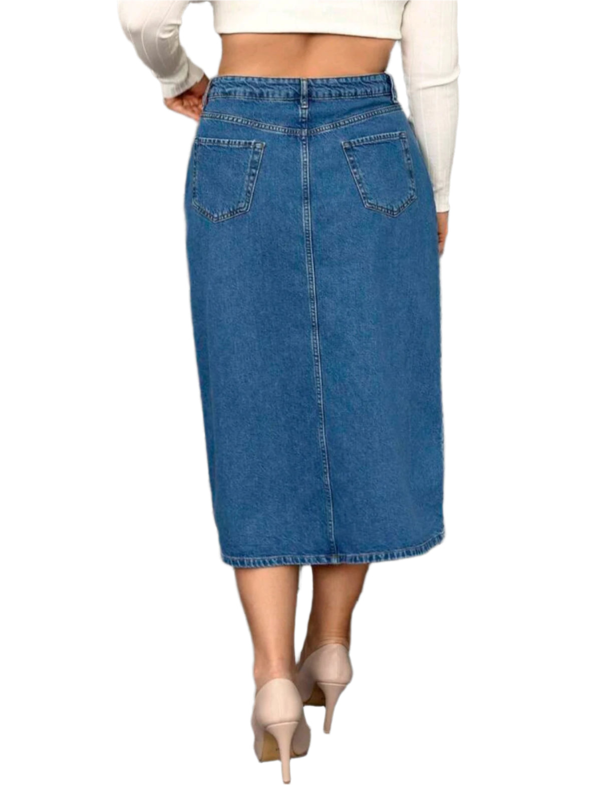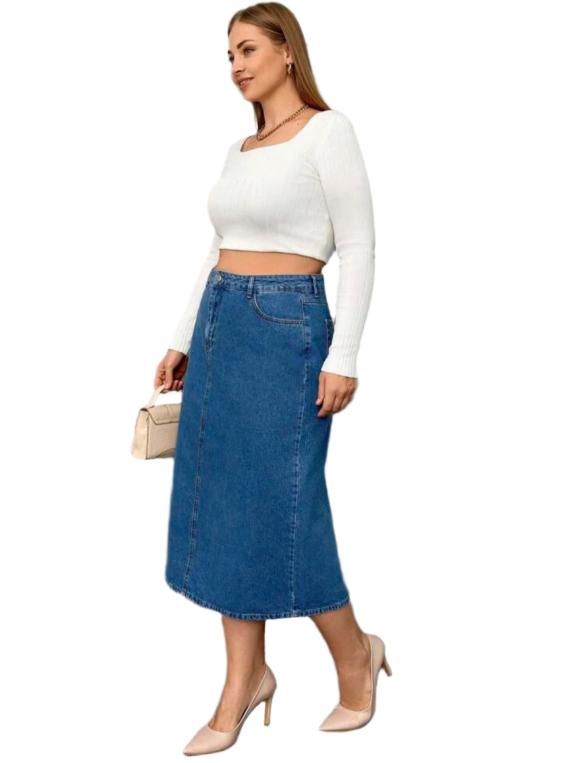 Címke nélküli, klasszikus kék midi farmer szoknya egyenes szabással és magas derékkal. Kényelmes és stílusos választás mindennapi viselethez, kombinálható elegáns vagy lezser felsőkkel. Gombos és cipzáras záródás, valamint övbújtatók a derékrészen.