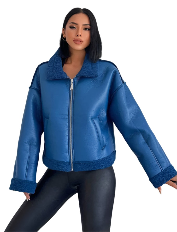 Címke nélküli, trendi és vagány kék műbőr kabát, amely garantáltan feldobja az őszi és téli szetteket. Bélelt belső része melegen tart, míg a laza fazon és a cipzáros záródás modern megjelenést biztosít. Ideális választás divatos hétköznapi viselethez vagy különleges alkalmakra.