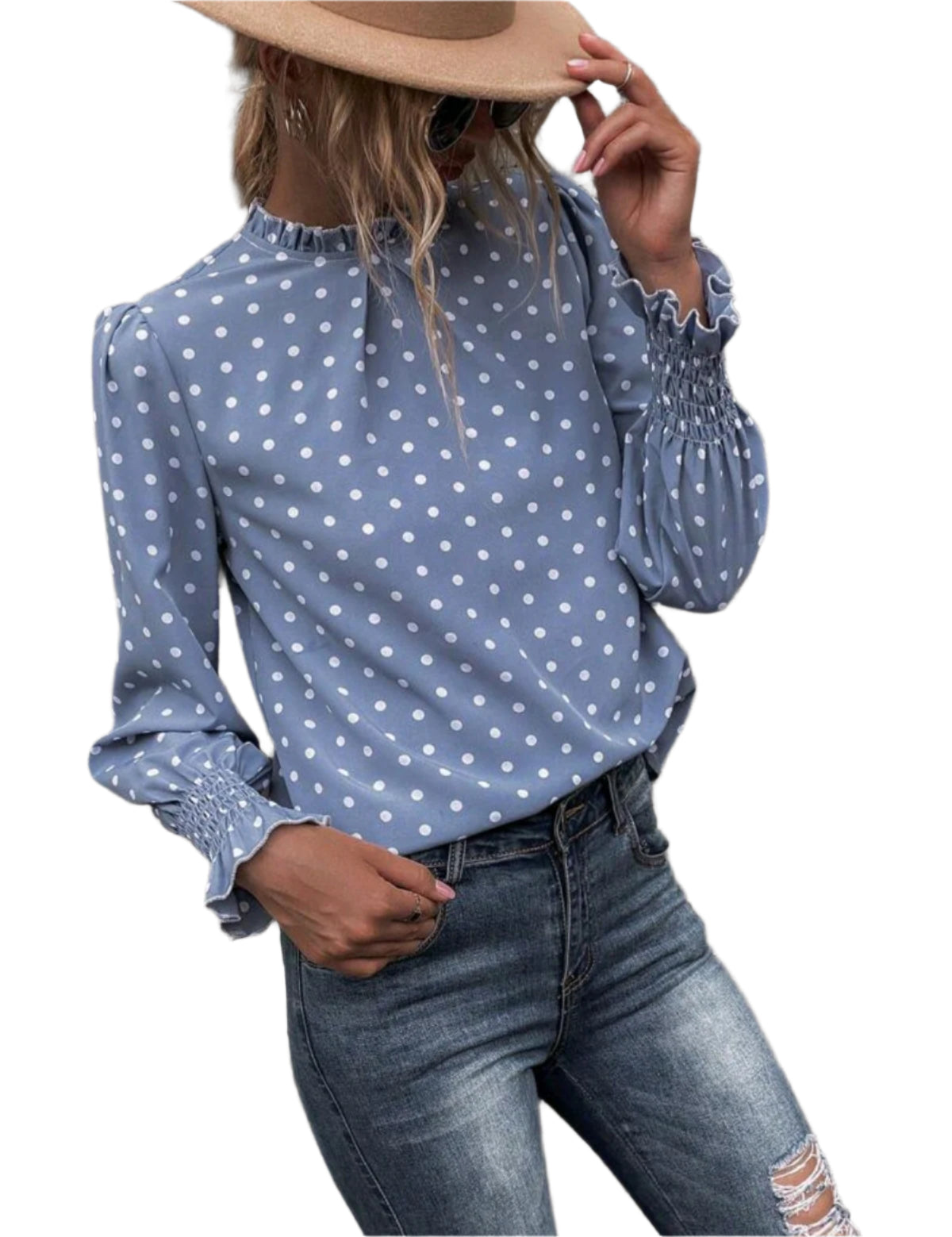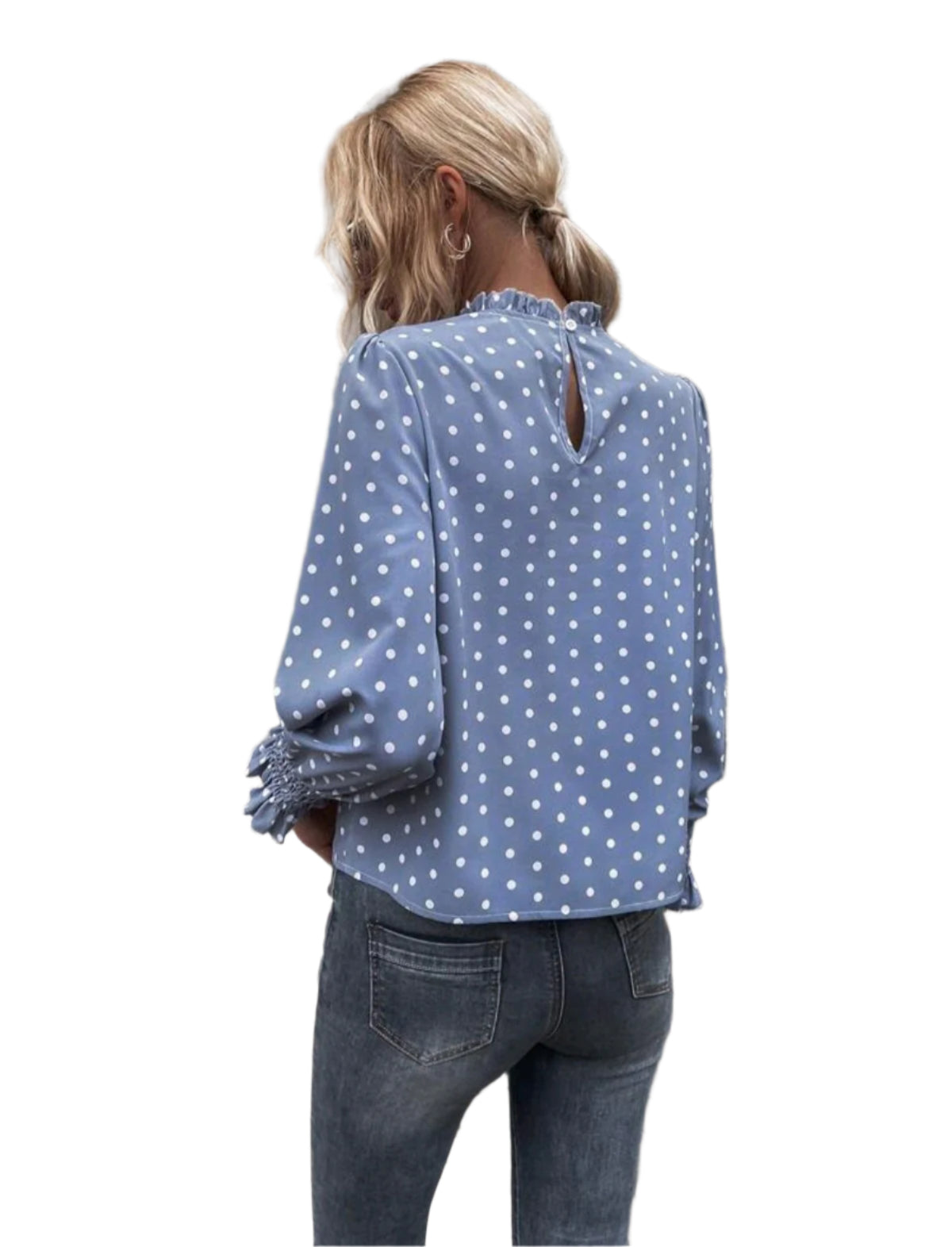 Címke nélküli, elegáns világoskék alapon fehér pöttyös felső, romantikus fodros nyakkal és mandzsettával. Hosszú ujjú, enyhén bő szabású kialakítás, amely kényelmes viseletet biztosít. Tökéletes hétköznapi és elegáns alkalmakra egyaránt.