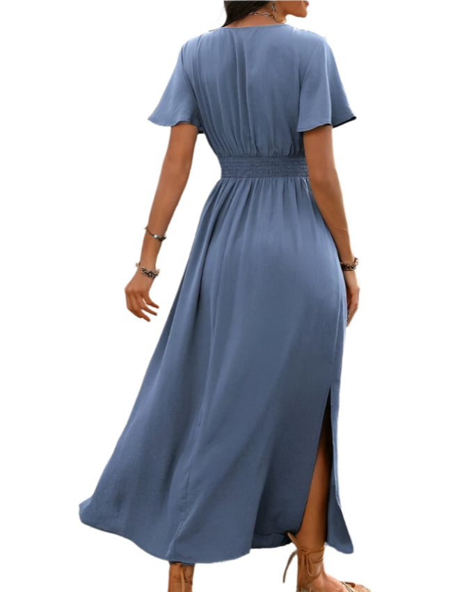Címke nélküli, kék rövid ujjú maxi ruha. Puha, légies anyagból készült, V-kivágással és rövid, bő szárnyas ujjakkal. A derékrész rugalmas és karcsúsított, az A-vonalú szoknyarész pedig kényelmes és nőies esést biztosít. Tökéletes választás nyári sétákhoz, nyaraláshoz vagy romantikus vacsorákhoz.