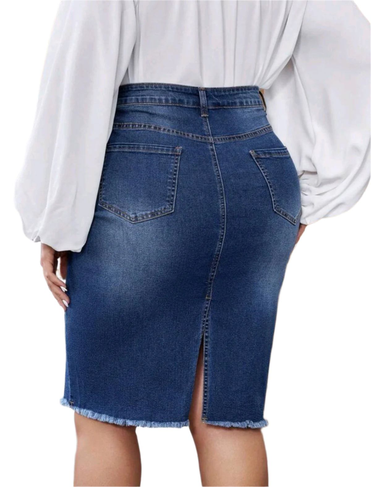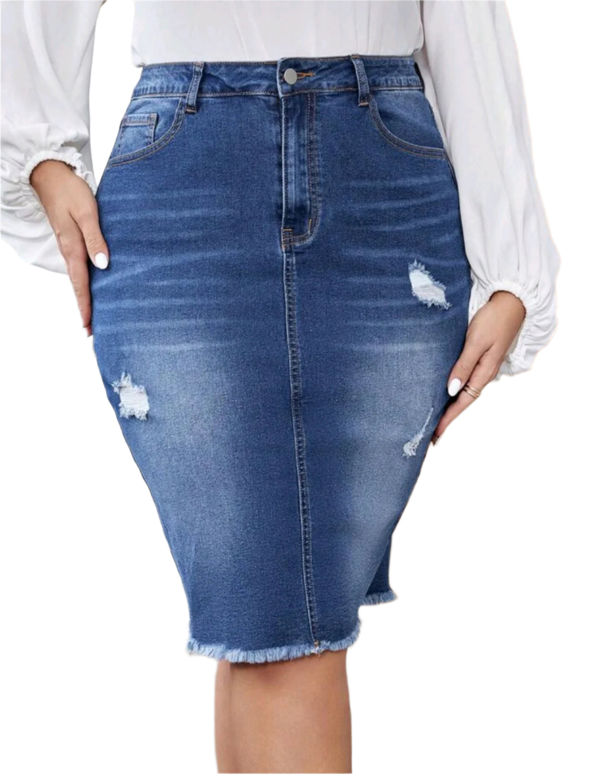 Címke nélküli, klasszikus kék farmer ceruzaszoknya szaggatott részletekkel és rojtos szegéllyel. Magas derekú kialakítása kiemeli az alakot, míg a rugalmas anyag kényelmes viseletet biztosít. Gombos és cipzáras záródás, valamint övbújtatók a derékrészen. Ideális mindennapi viselethez, kombinálható elegáns vagy lezser felsőkkel egyaránt.