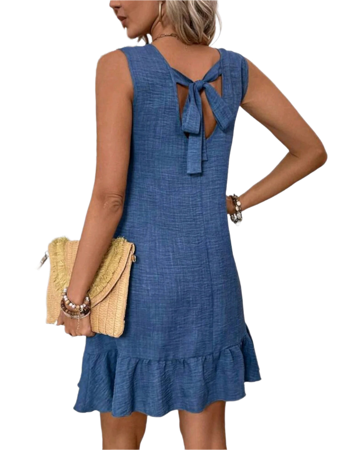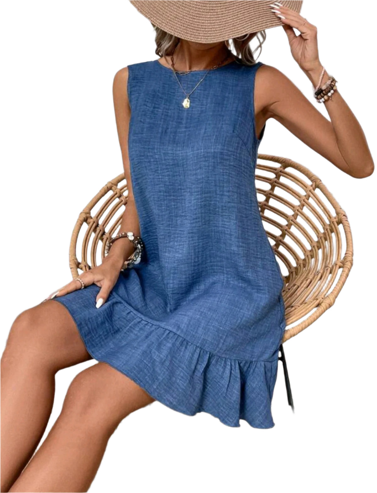 Címke nélküli, könnyed, kék színű miniruha ujjatlan kialakítással. Laza szabása és fodros alsó része kényelmes viseletet biztosít meleg időben. Ideális hétköznapi, nyári outfitekhez.