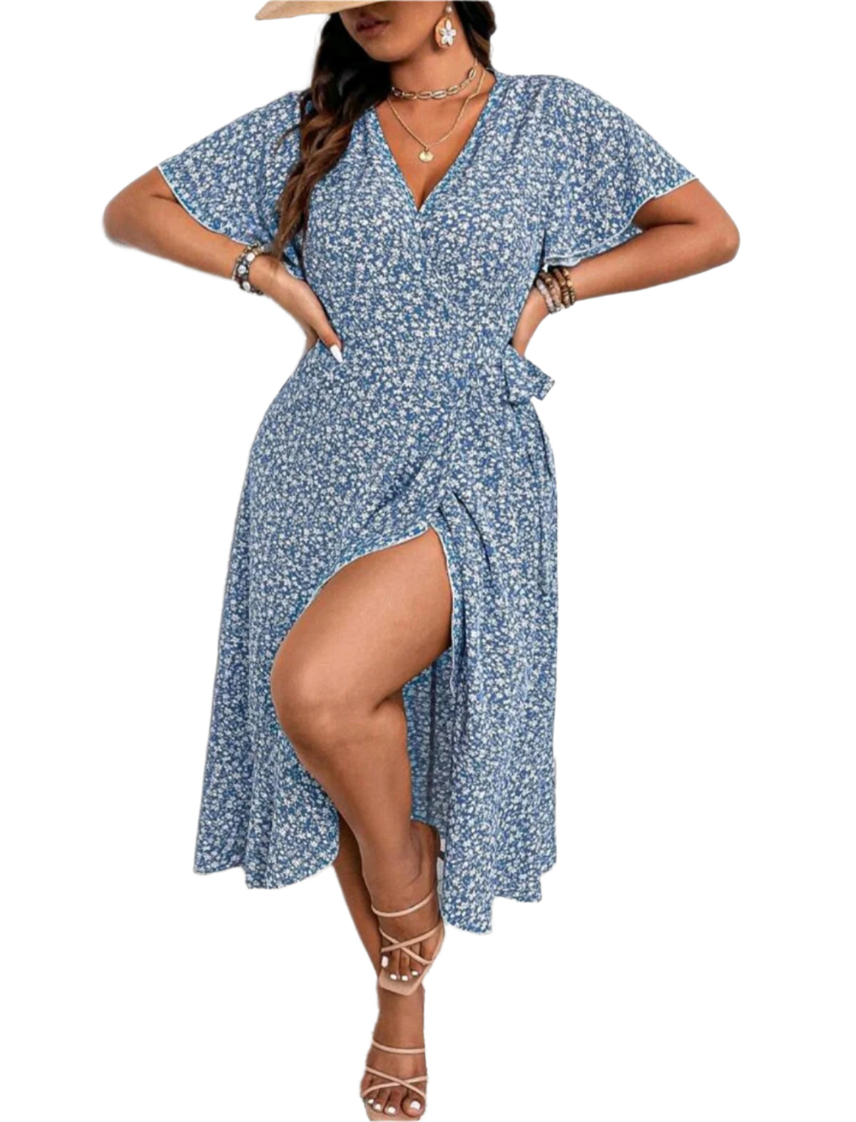 Címke nélküli, kék alapon apró virágmintás, rövid ujjú, V-nyakkivágású ruha. Deréknál megkötős kialakításával hangsúlyozza az alakot, átlapolt fazonja pedig nőies, enyhén szexi megjelenést kölcsönöz. Tökéletes választás nyári napokra, sétákhoz, kirándulásokhoz vagy akár egy kellemes esti programhoz.