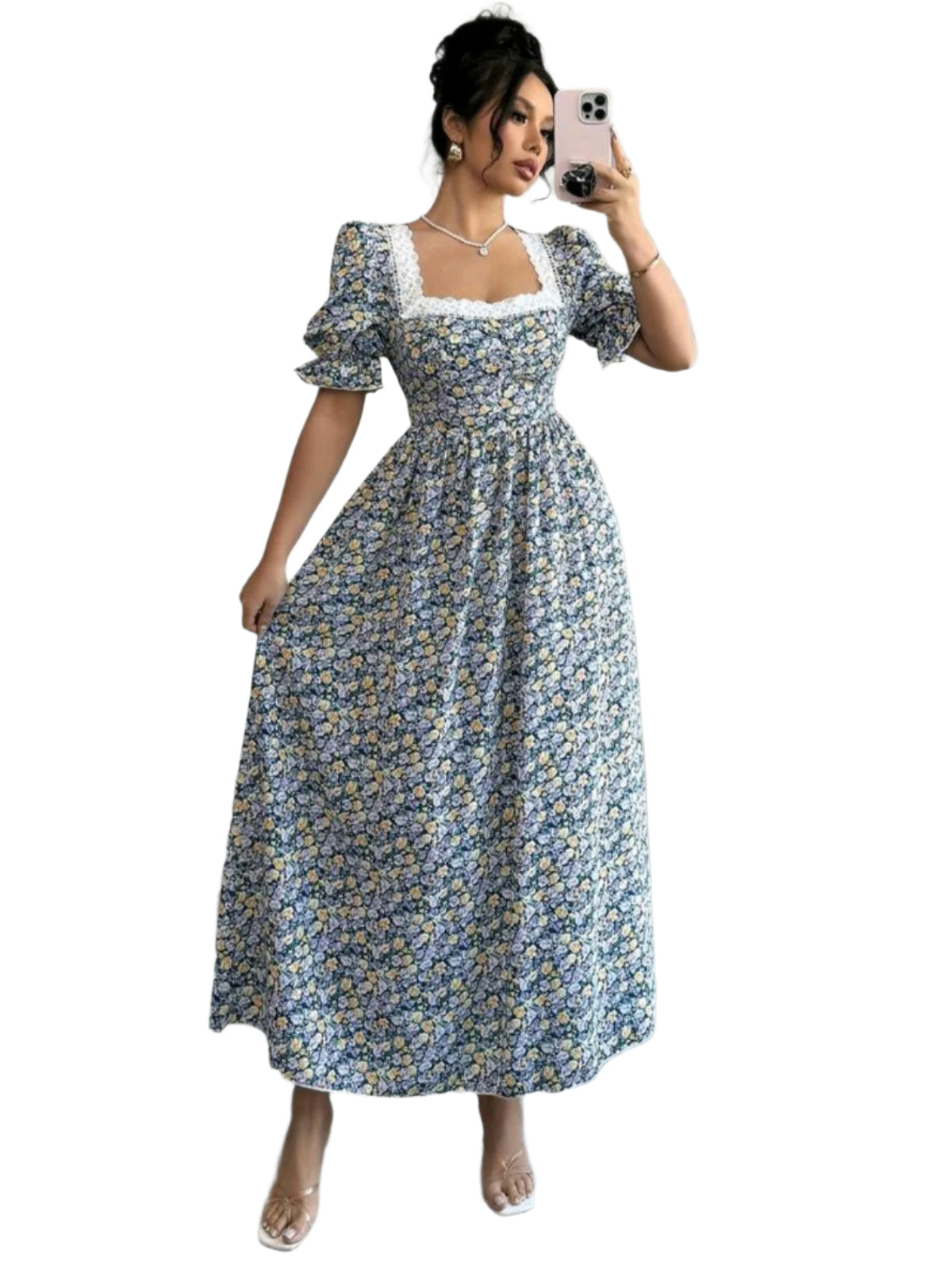 Címke nélküli, női vintage stílusú maxi ruha, kék alapon apró virágmintával. Négyzet alakú csipkés nyakkivágással, rövid puffos ujjakkal és karcsúsított derékrésszel. Hosszú, lágyan bővülő szoknyarésszel, romantikus és nőies megjelenés, tökéletes nyári és alkalmi viselethez.